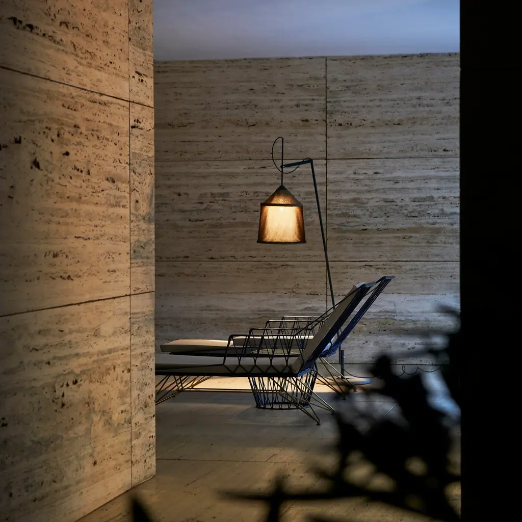 Highlight the beauty of your outdoor space with the Jaima Outdoor LED Floor Lamp from Marset. This creatively built, versatile lamp features a 180-degree rotatable stainless steel frame and adjustable height, perfect for any section of your setup. Inspired by North Africa's Bedouin tents, the textilene shade adds a touch of modern style with an antiquated charm. Highlights