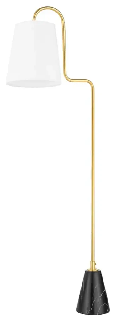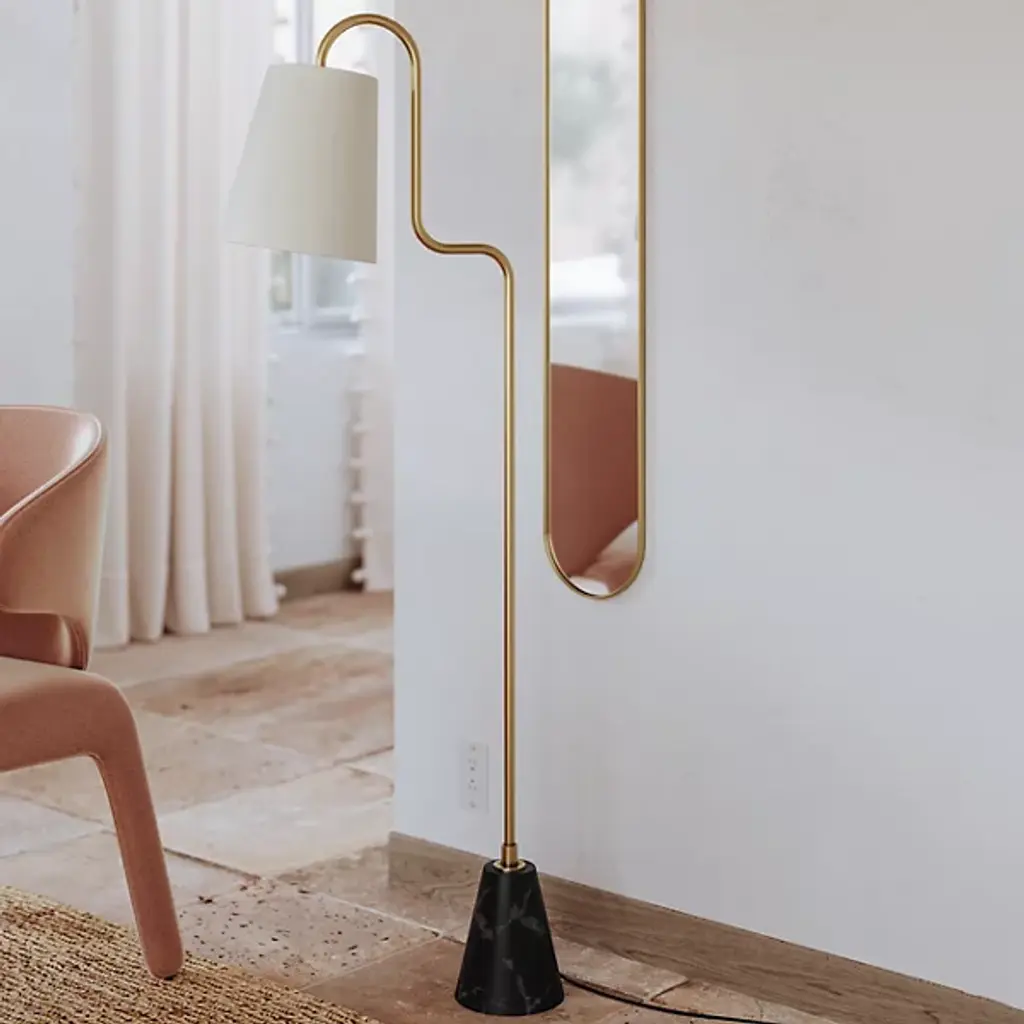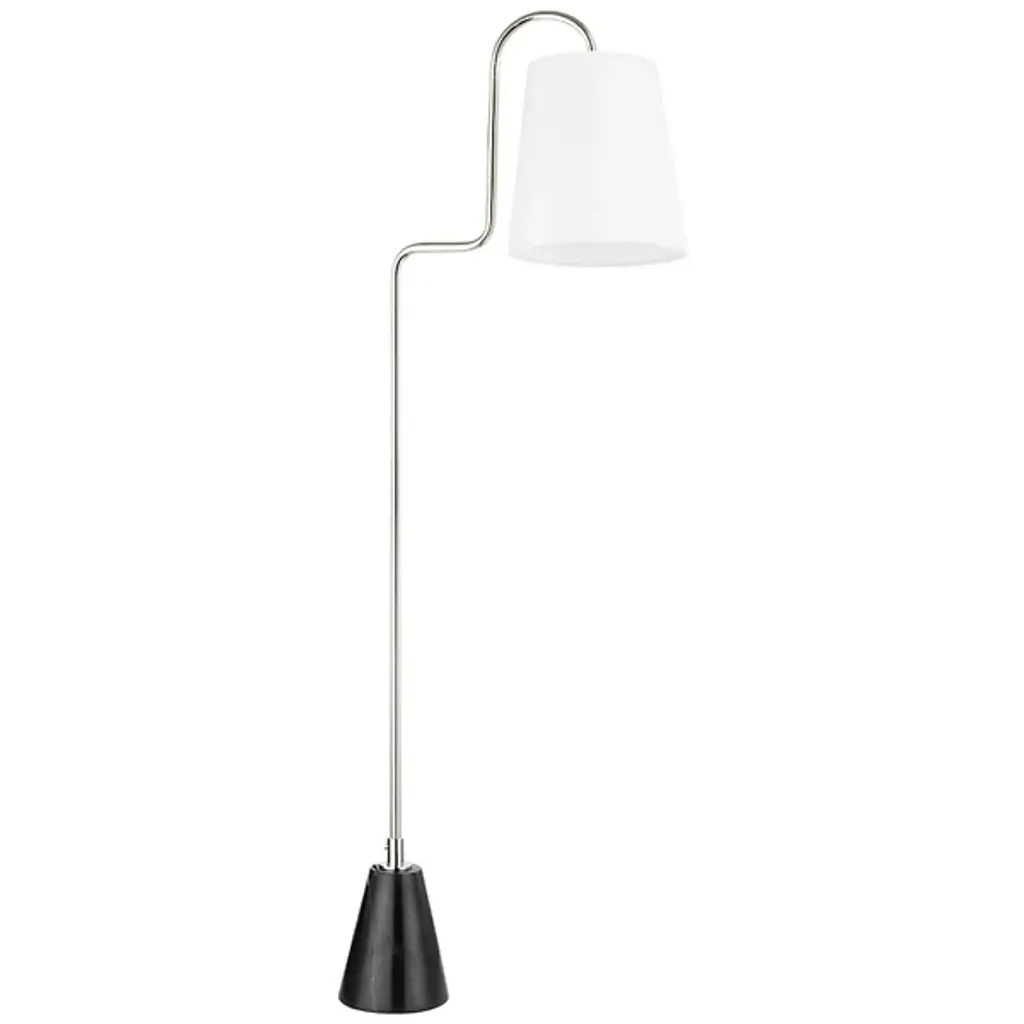 Add an element of high-design to your space with the Jaimee Floor Lamp from Mitzi. Inspired by some of the iconic, revolutionary designs of the Modern Movement, a structured linen shade is suspended from a squiggly, swooping arm that extends upward from the marble base. Place the Jaimee Floor Lamp next to your favorite chair provide ample lighting for reading while giving your living room, den, bedroom, or office a chic update.