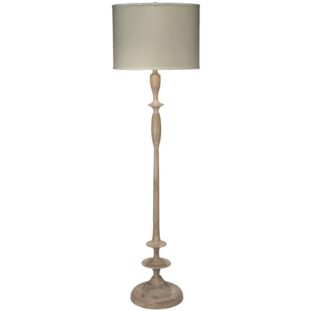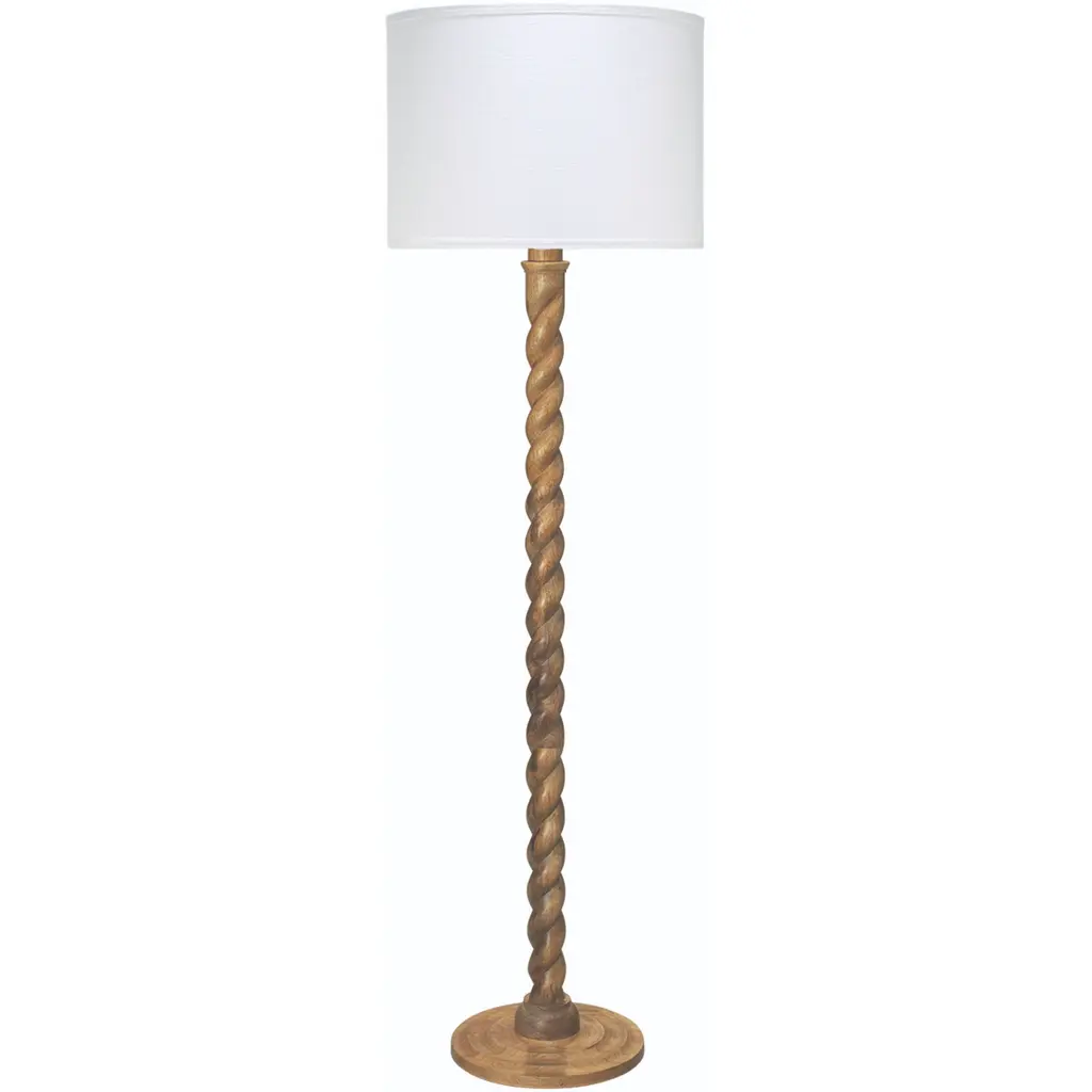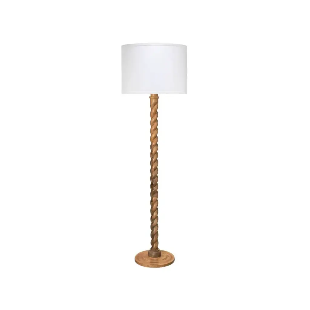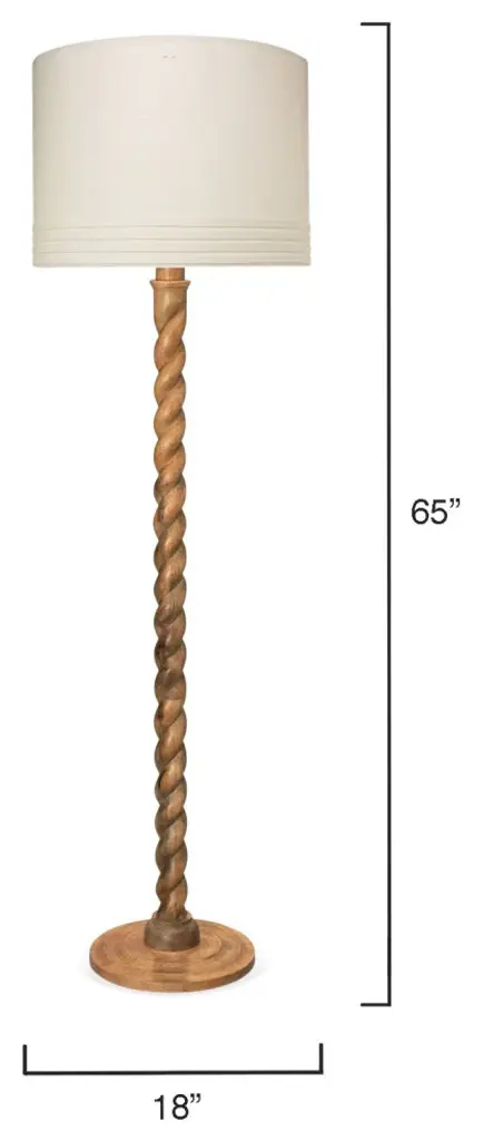 Inspired by traditional woodworking techniques, this floor lamp is hand-carved of mango wood. Fusing modern and rustic influences, the twisting column rises upwards like a vine and makes for a striking sculpture in any room Wood floor lamp with twist design through body. Shade dimensions: 18"Dia. x 13"T. Uses one 150-watt E26 bulb. Overall: 65.5"H x 18"W x 18"D Cord length: 8 ft. Hanging hardware included. Dust with dry cloth only. UL approved. Imported. Boxed weight, approximately 20 lbs. Shipping Direct from Vendor, usually ships within 10 business days. About Jamie Young: In 1997, Jamie Young Jeter and David Jeter took a day trip to Mexico, where they filled their car trunk with gardening pots they discovered in a roadside shop. When they returned to Los Angeles, they promptly sold the entire haul to a local florist. Recognizing an under-served market, the two artists began to design and produce their own line of interesting flower pots, only to discover that the rustic, handcrafted quality of the pieces would make unusual bases for lamps—thus the Jamie Young Company was born.