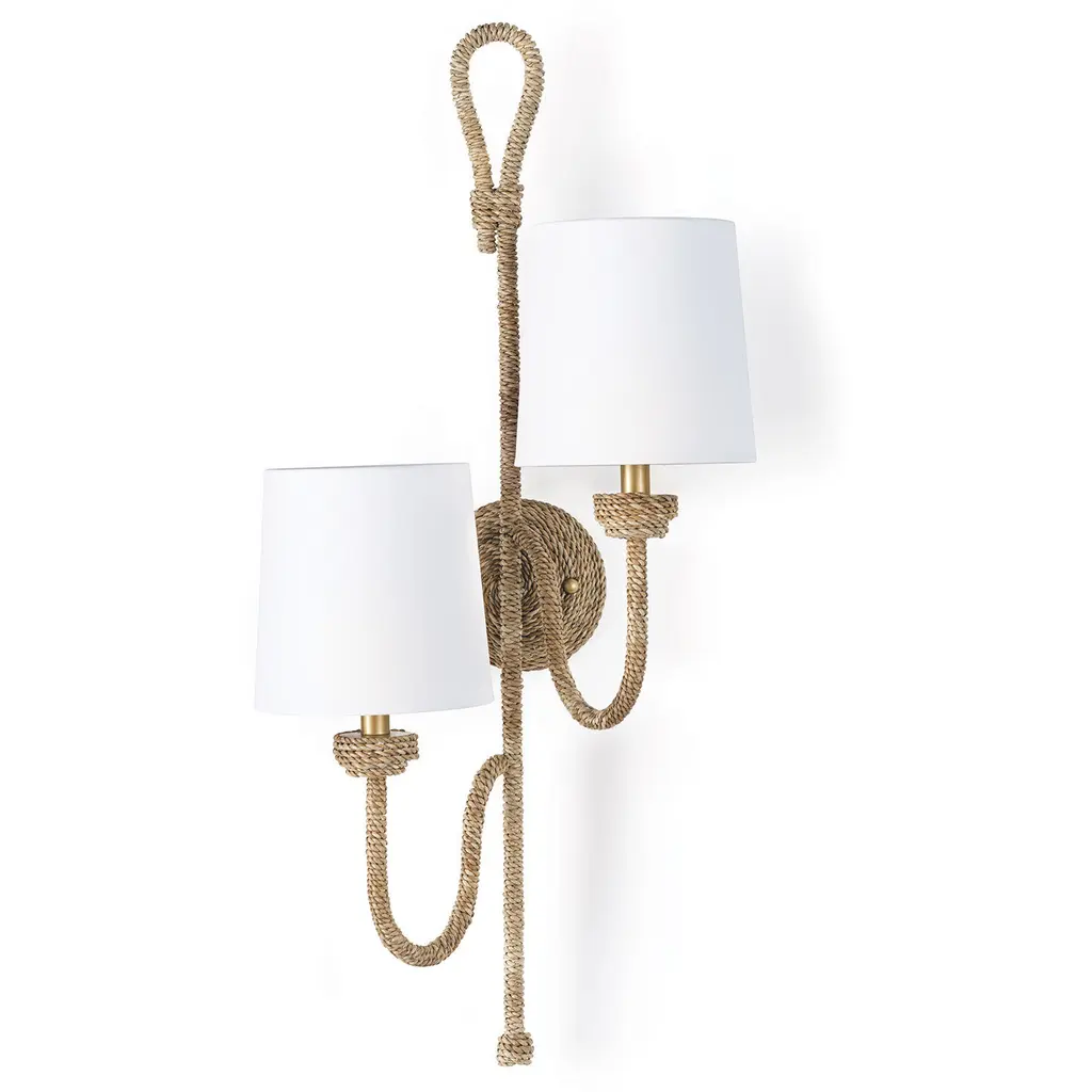 This nautically inspired floor lamp begins as a simple structure with a clear acrylic base but is given bold texture with the addition of natural rope wrapped around its entire body. The single knot detail brings unexpected personality, and the lamp is topped with a banded white linen shade. The matching rope finial is the cherry on top of this uniquely sculptural floor lamp.