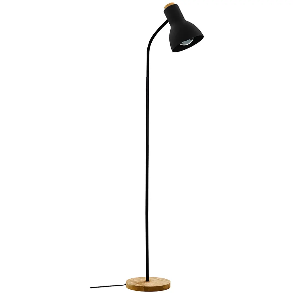 The Jenson Floor Lamp by Huxe is long and lean, industrial but with a natural touch. It has a slim stem that curves at the top, positioning the bell-shaped shade at the angle ideal for reading or other tasks. The base is a round of solid wood, and the shade also includes a wood accent on the top. The result is sleek but with textural elements to give this floor lamp warmth for modern living rooms or workspaces.