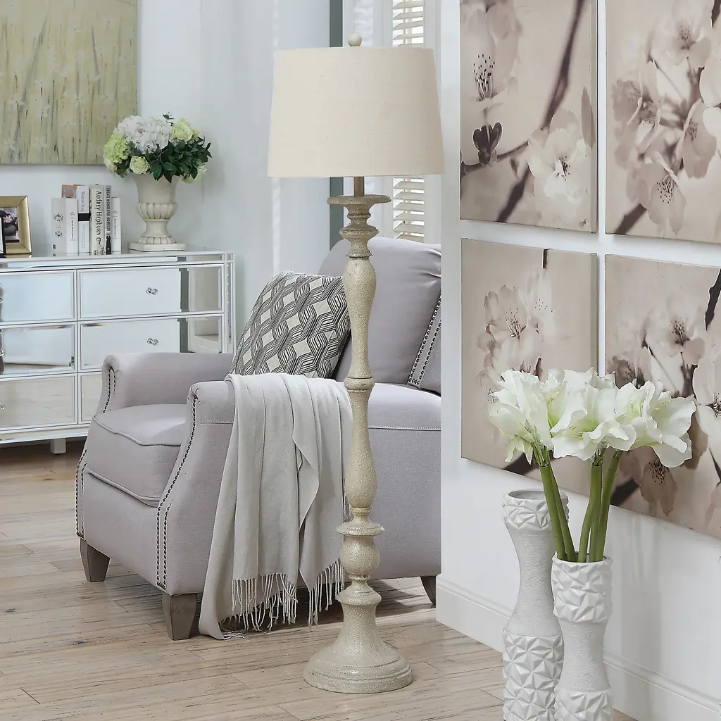 Light up your home in classic style with this 60-inch Joaquin floor lamp. Antique styling and a whitewash distressed finish lend this lamp a traditional rustic appeal that is accentuated by its candlestick base. The grey linen fabric of the shade ties together the look while dispersing light for a peaceful ambiance.