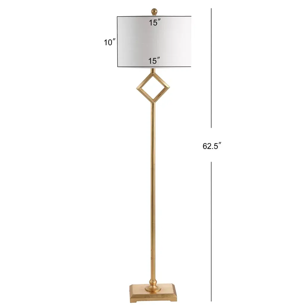Bring the refined style of modern luxury to any living room with this contemporary floor lamp. Designed with a diamond cut-out detail, its statuesque figure rests on graceful pediment while its rich gold leaf finish is illuminated by a white cotton shade. We love the matching finial and silk-wrapped cord for their beauty, and the LED-compatibility and UL-rating for their modern conveniences.