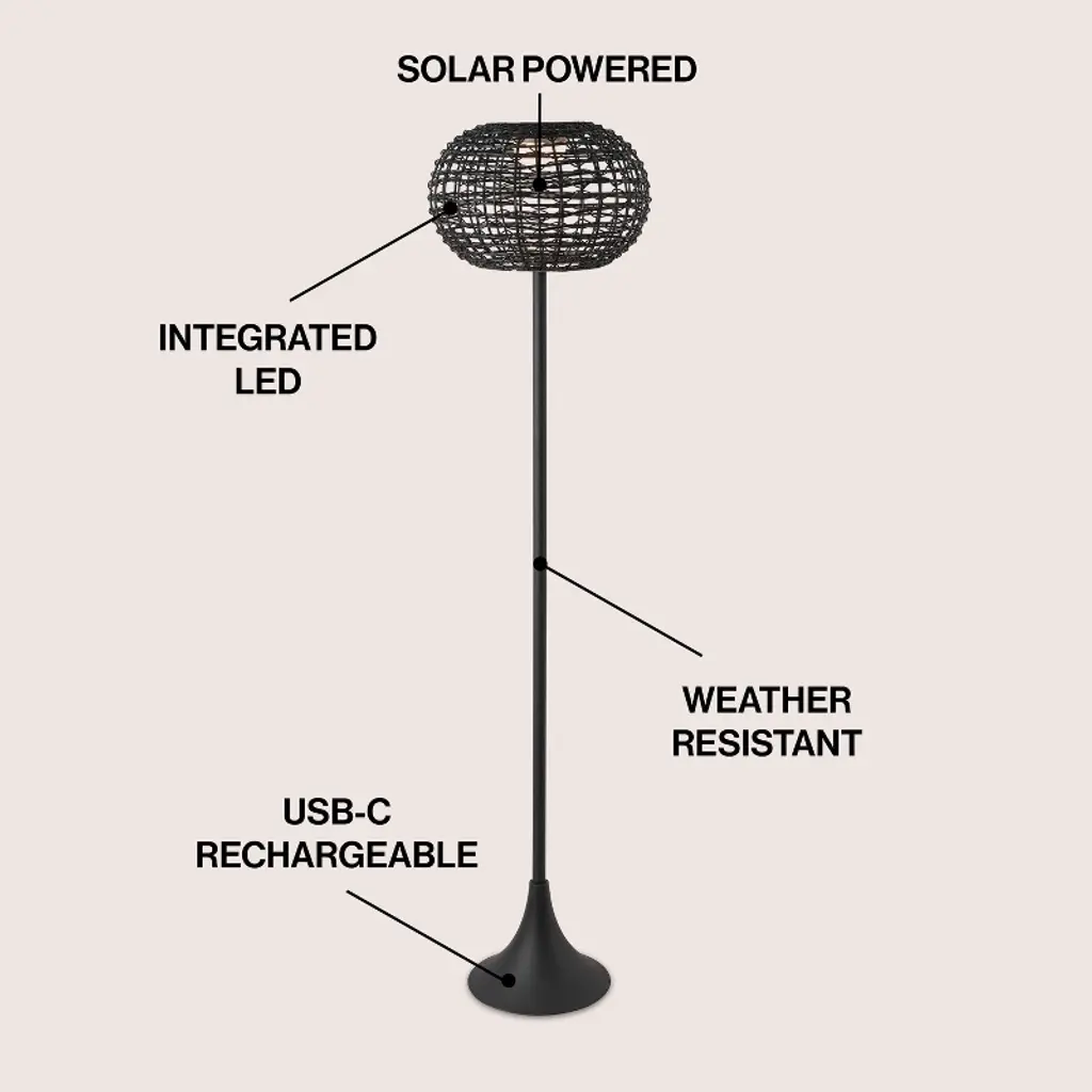 Add warm, cozy lighting to the patio, coastal deck or porch with this modern outdoor floor lamp. The sleek metal base is topped by a durable shade of woven plastic rattan, and a bright LED bulb that turns on at dusk and off at dawn. Versatile design includes a battery that can recharge in the sun, or with a standard USB-C cable (not included).