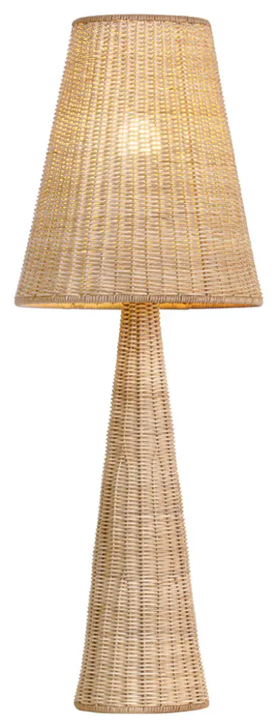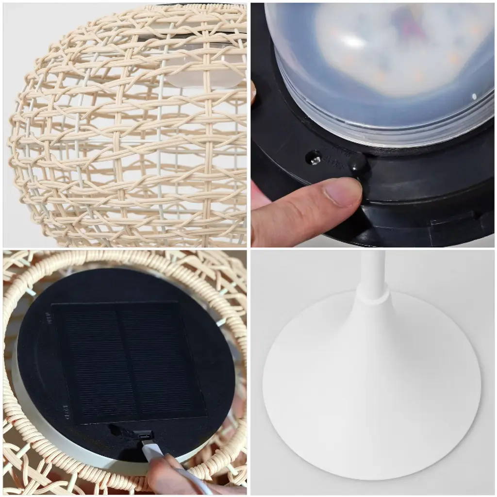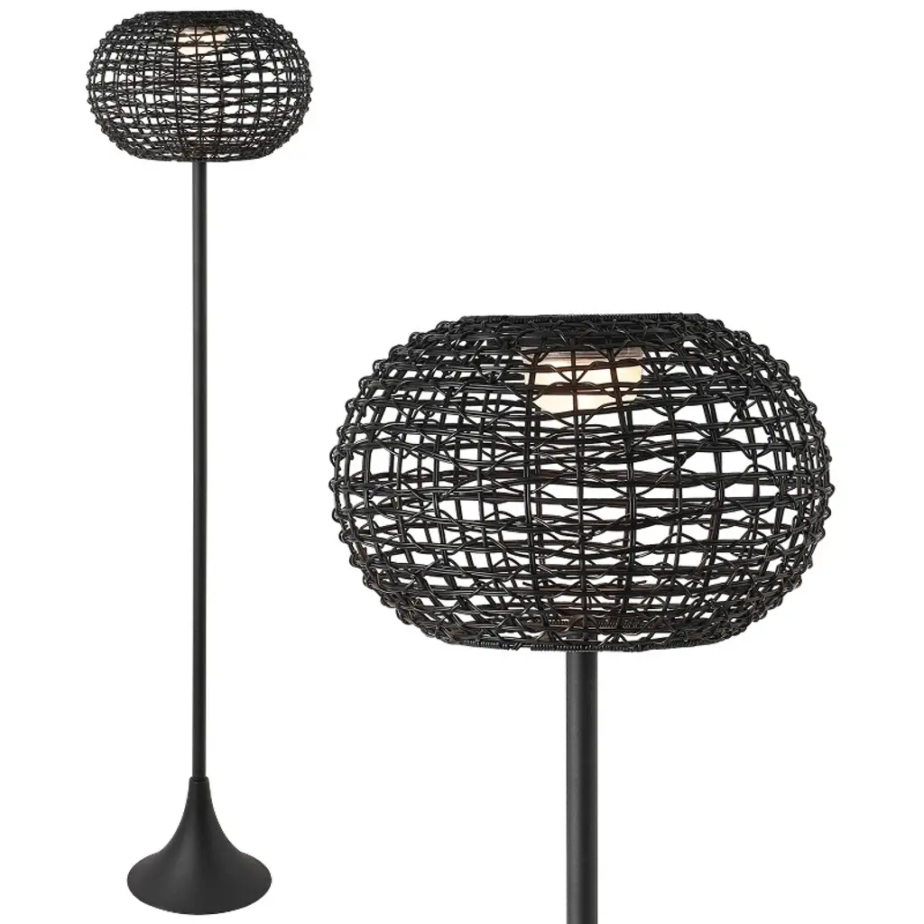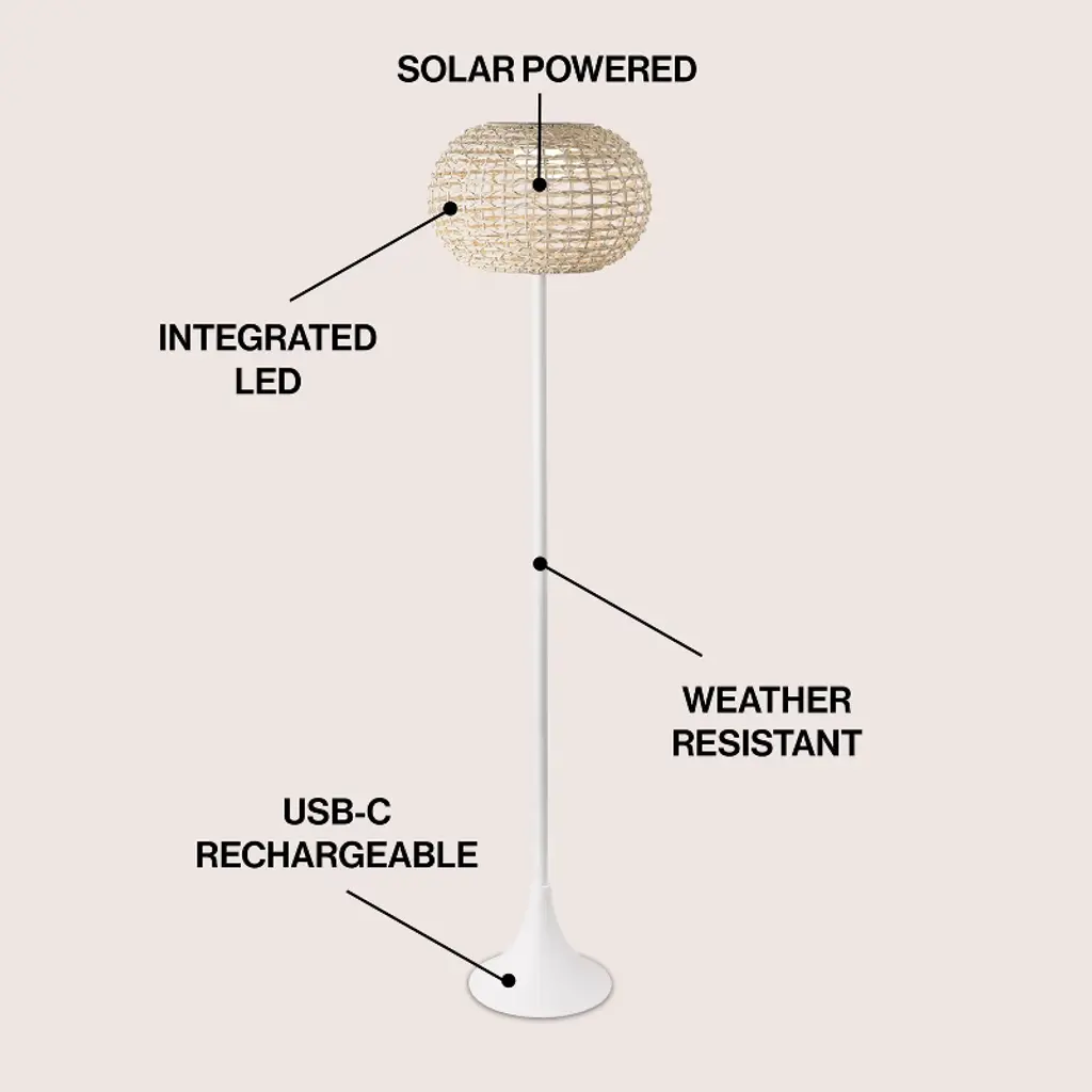 Add warm, cozy lighting to the patio, coastal deck or porch with this modern outdoor floor lamp. The sleek metal base is topped by a durable shade of woven plastic rattan, and a bright LED bulb that turns on at dusk and off at dawn. Versatile design includes a battery that can recharge in the sun, or with a standard USB-C cable (not included).