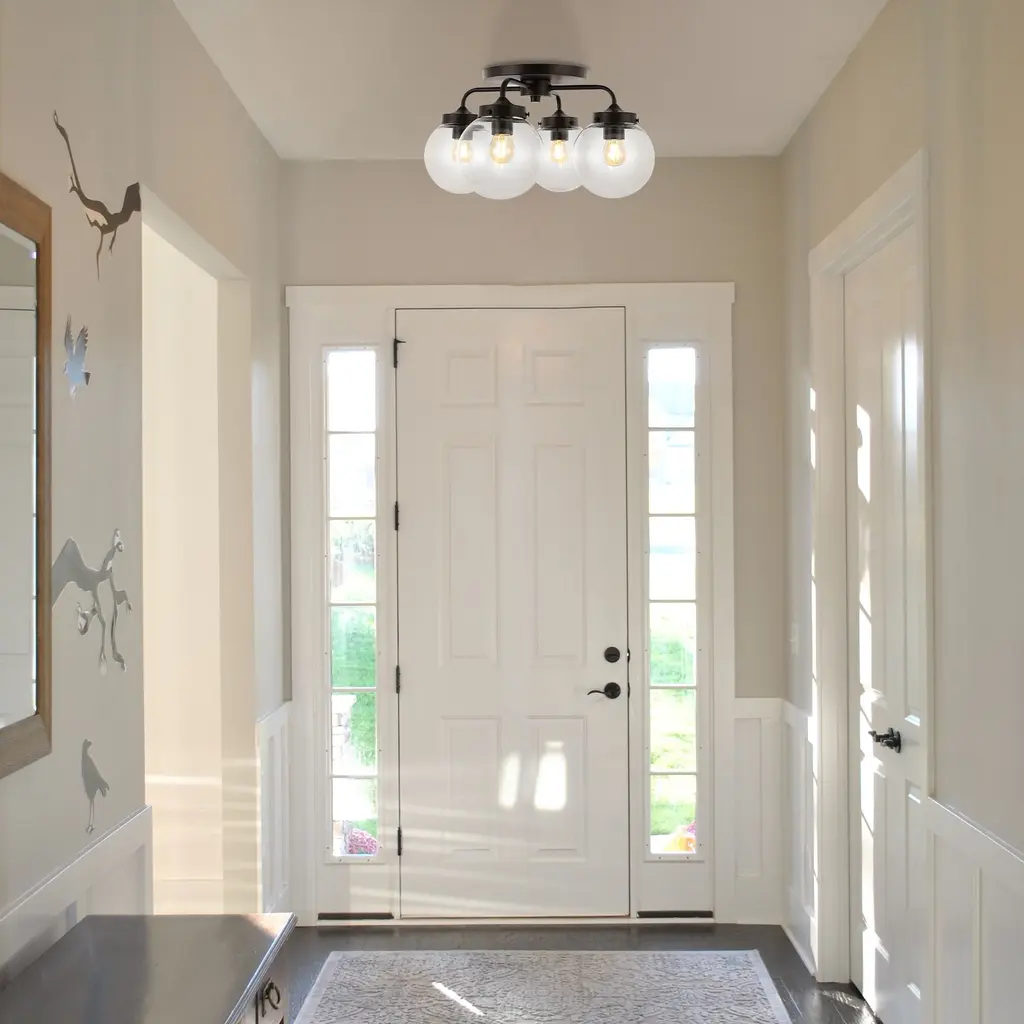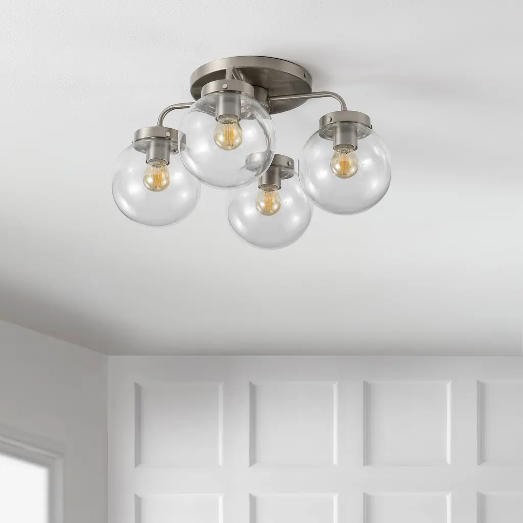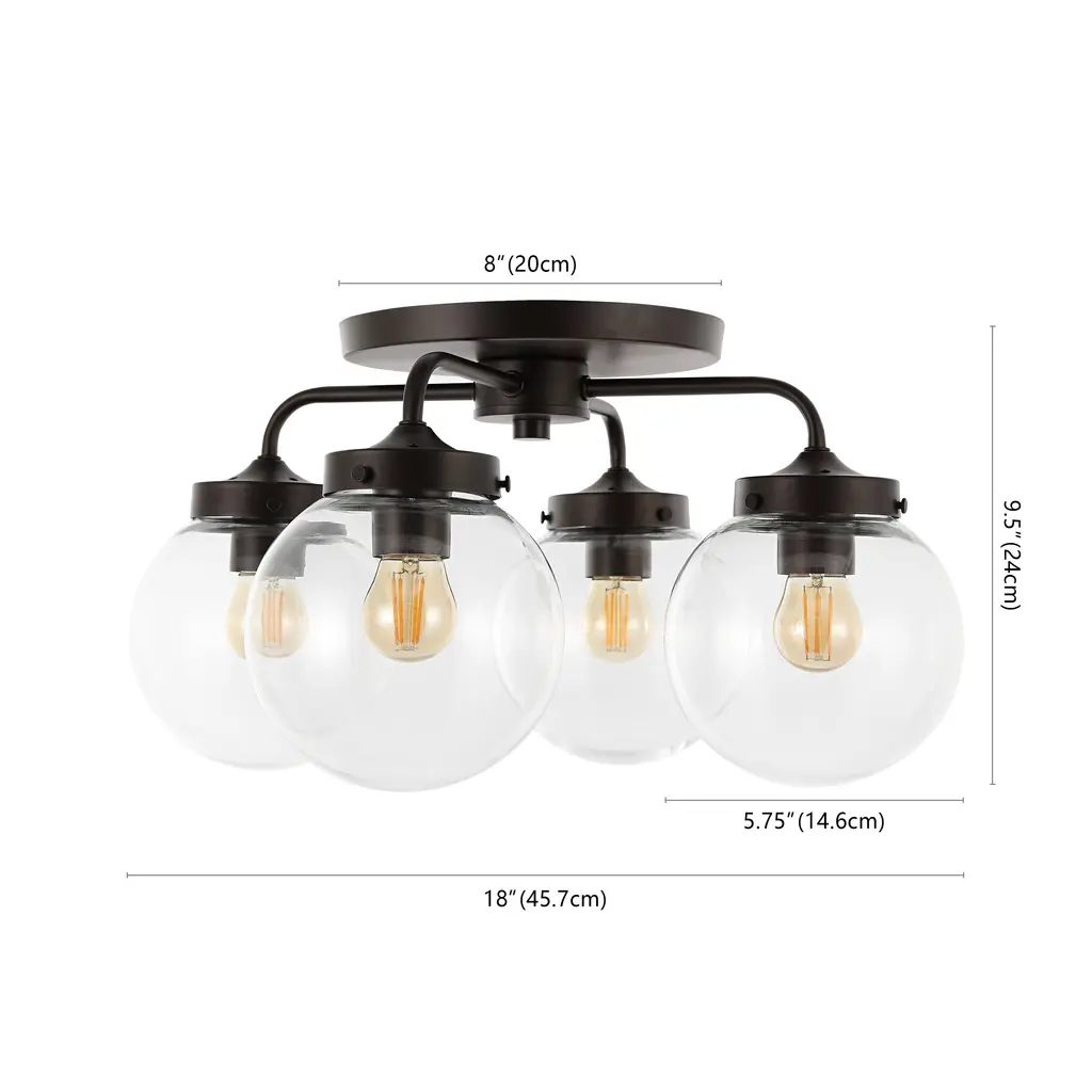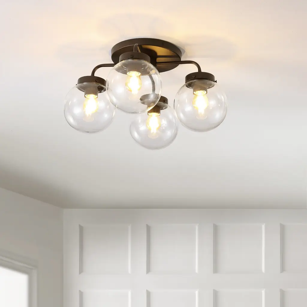 Add modern style to your home with our mid-century-inspired ceiling fixture. Four Edison-style LED bulbs hang from a sleek metal frame; clear glass globe shades provide plenty of light. Perfect for low ceilings, this light fixture adds a retro touch to the kitchen, living room, bedroom, or entry.Features:Dimensions:About us:You see a lamp.We see a decorative work of art.A perfectly curved shade casts a dramatic shadow on a floor. Compatible with LED lightbulbs: as easy on the environment as they are on the eyes. The JONATHAN Y Lighting collection considers every detail from impeccably sourced materials to designer styling. And our prices are so attractive, we've transformed a functional necessity into a fashion accessory.JONATHAN Y Lighting - a fashion revolution in home decor.