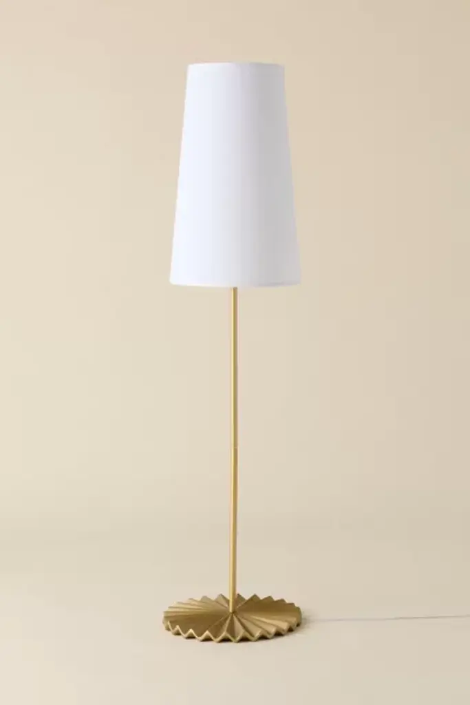 Create a mid-century modern lighting display with this standing lamp featuring a pleated resin base topped with an extra-tall, tapered drum shade. Available exclusively at Urban Outfitters. **Features** \- Julie Pleated Floor Lamp from UO Home’s Julie lighting collection \- Standing floor lamp with a resin base in a pleated silhouette \- Tall, tapered fabric lamp shade \- Plug in; inline switch \- Requires two E26 Type A 60W bulbs - not included \- UO exclusive **Content + Care** \- Assembly required - assembly instructions and hardware are included \- Plastic resin, iron, fabric \- Wipe clean \- Imported \- Made in compliance with US electrical standards. To use this item outside of the US, pair with an outlet adapter and voltage converter made specifically for use in your location. **Size** \- Wattage/Voltage: 60W/120V \- Overall dimensions: 15.6"dia x 62.3"h \- Base dimensions: 15.6"dia x 1.3"h \- Shade dimensions: 10.5"dia x 24"h \- Cord length: 7 ft \- Weight: 11.7 lbs \- Shipping package dimensions: 18.9"l x 5.1"w x 27.2"h \- Shipping package weight: 13 lbs