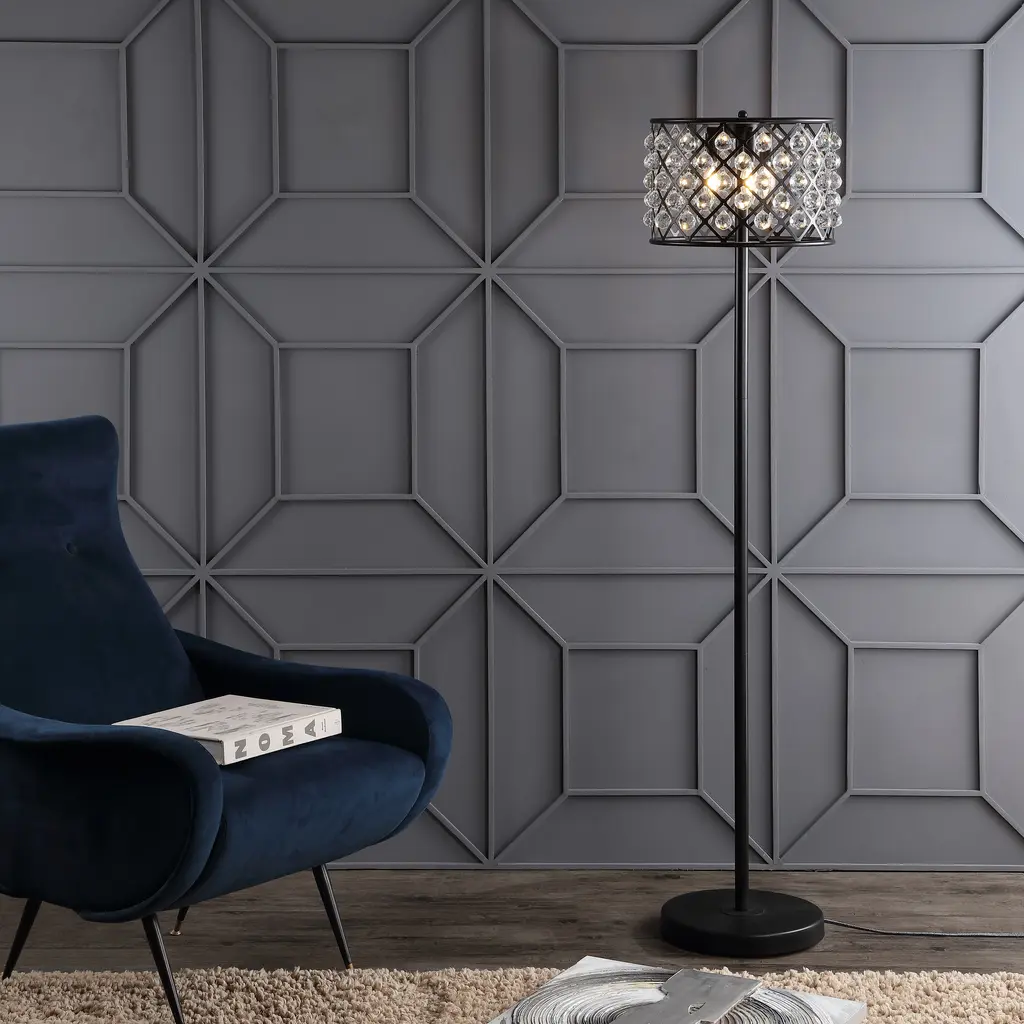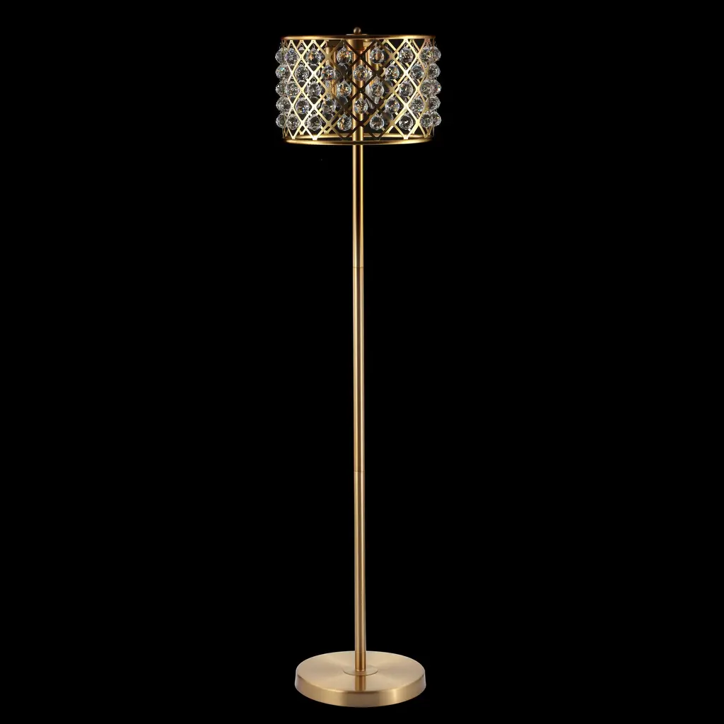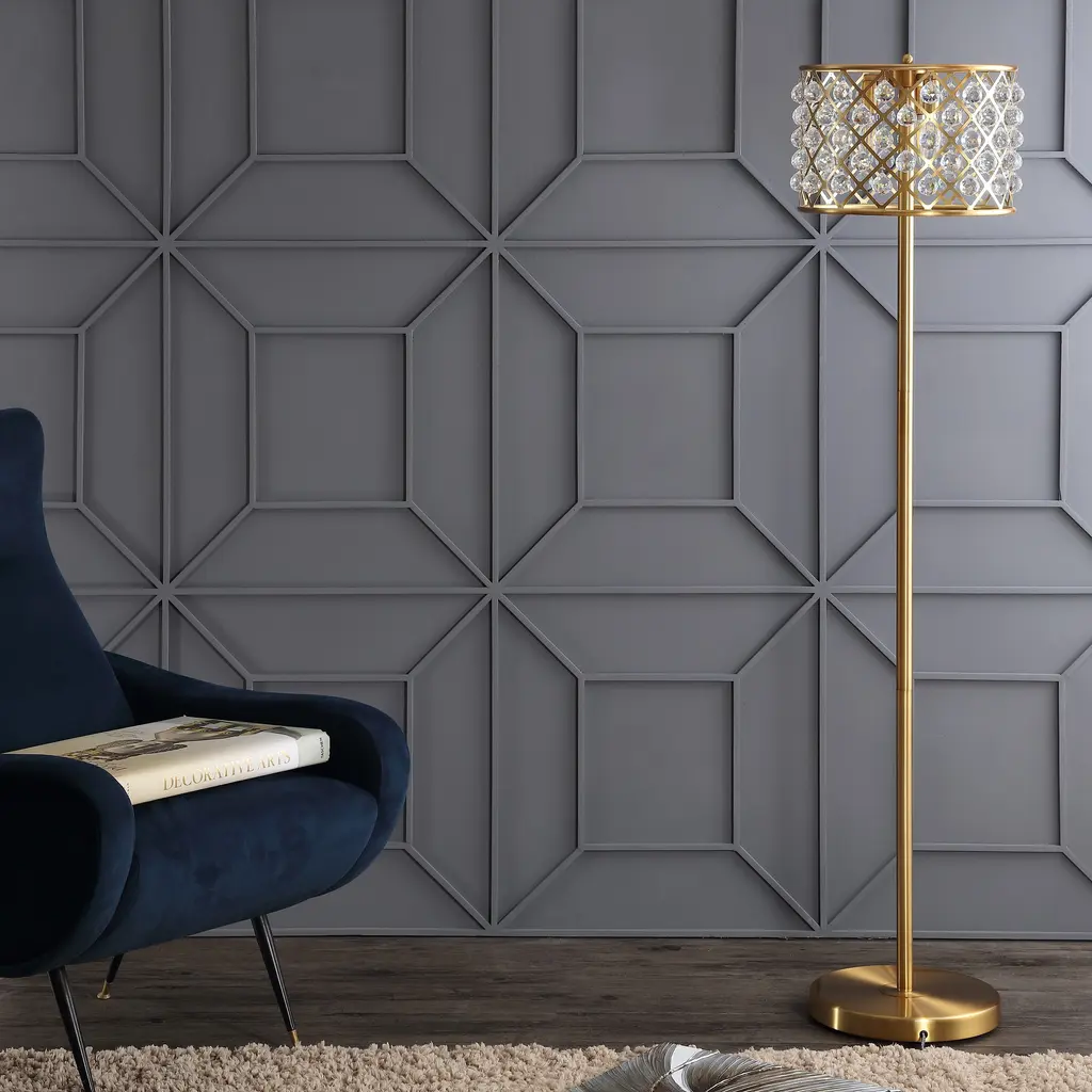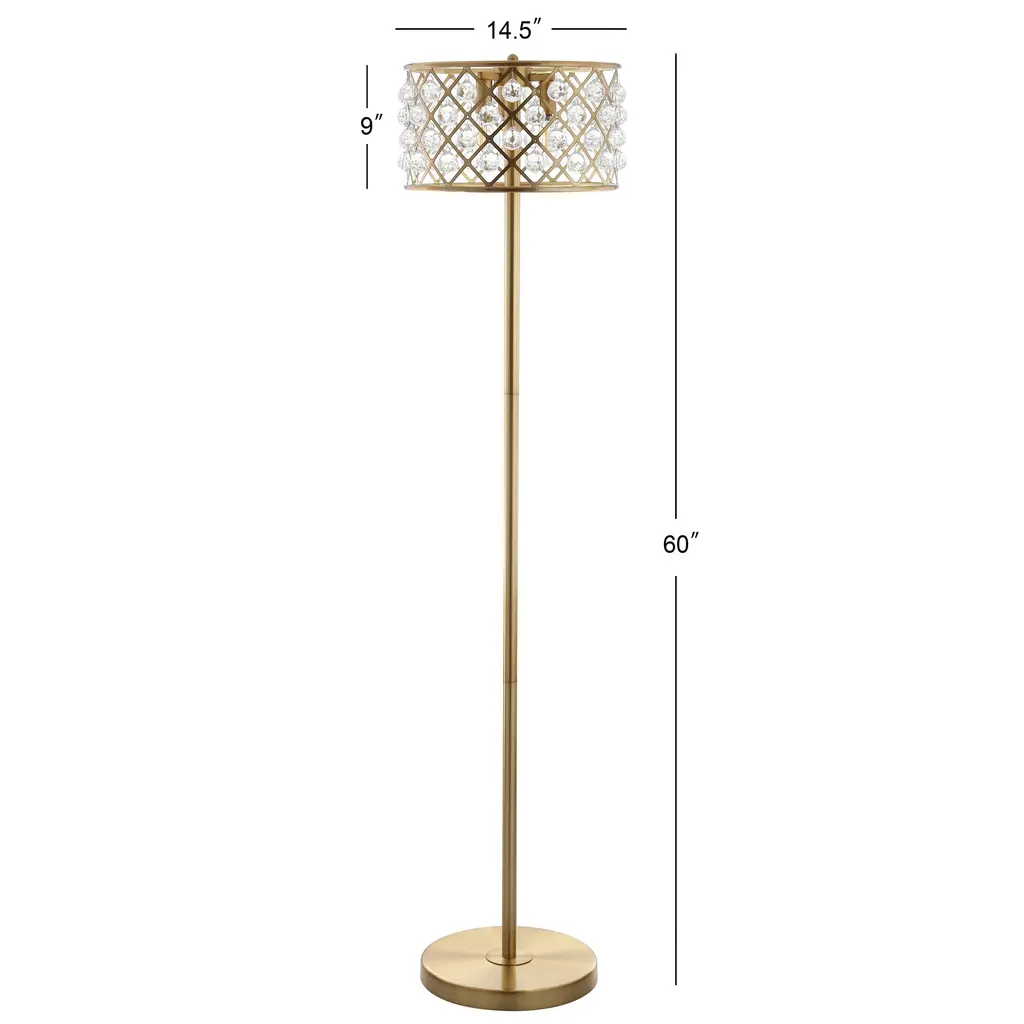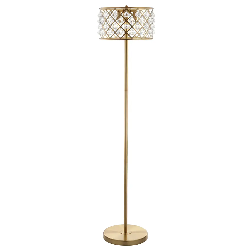 A metal drum with a geometric lattice pattern will catch your eye as the shade of this inviting satin brass floor lamp. With crystal beads surrounding the fretwork, the light refracts beautifully on the surrounding walls, filling your home with elegant ambiance. Style extends all the way to the plug with a foot step switch and a black and silver silk-wrapped cord. Features:Dimensions:About us:You see a lamp.We see a decorative work of art.A perfectly curved shade casts a dramatic shadow on a floor. A silk cord you never want to hide. LED lightbulbs: as easy on the environment as they are on the eyes. The JONATHAN Y Lighting collection considers every detail from impeccably sourced materials to designer styling. And our prices are so attractive, we've transformed a functional necessity into a fashion accessory.JONATHAN Y Lighting - a fashion revolution in home decor.