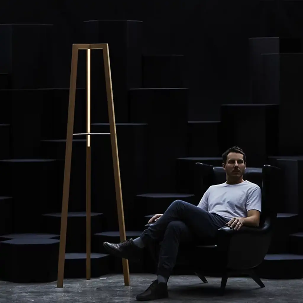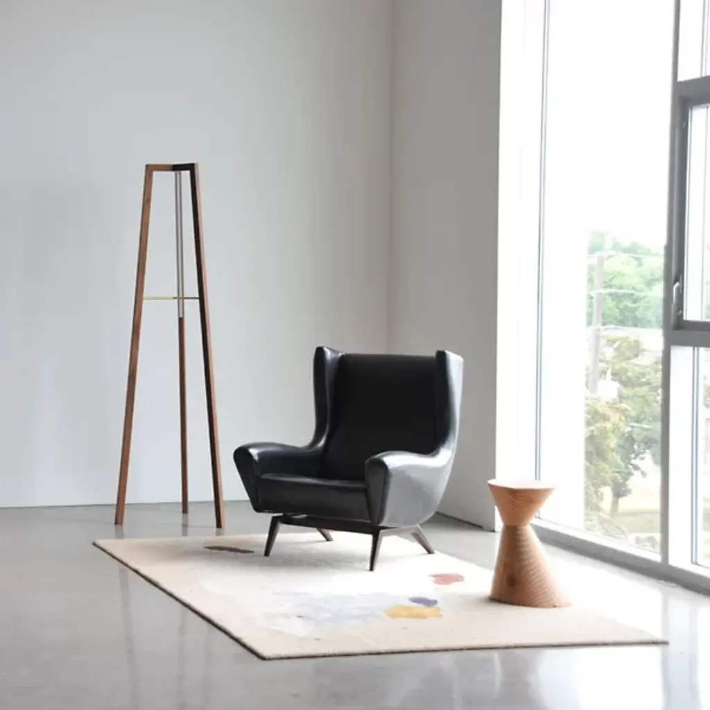 Accent your home with the elemental strength and beauty of the Junction LED Floor Lamp by hollis+morris. This fixture stands over six feet tall in a tripod formation crafted from natural wood legs. Its integrated LED light source illuminates frosted bands running along the interior of the piece, casting an ambient and inward glow. This fixture elegantly combines natural material with a clean, minimalistic design that brings an artful element to the home.