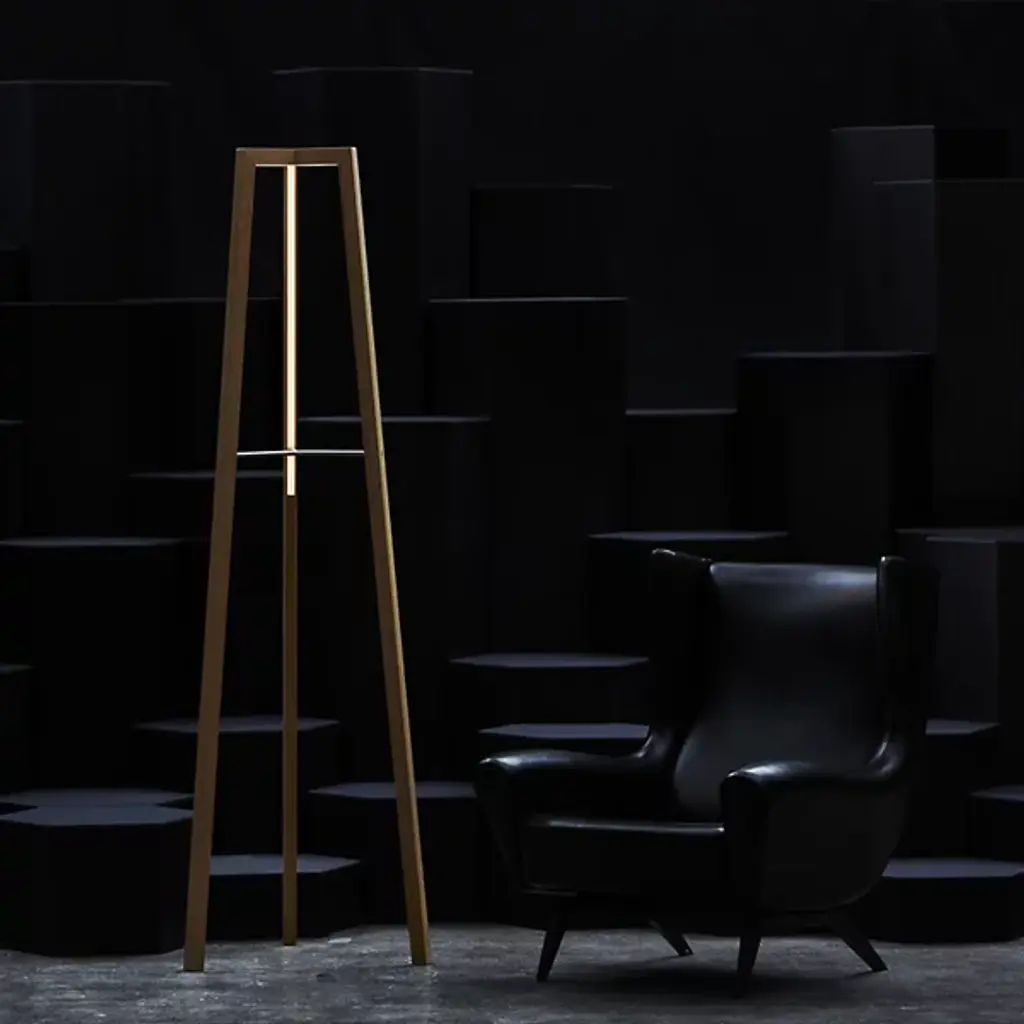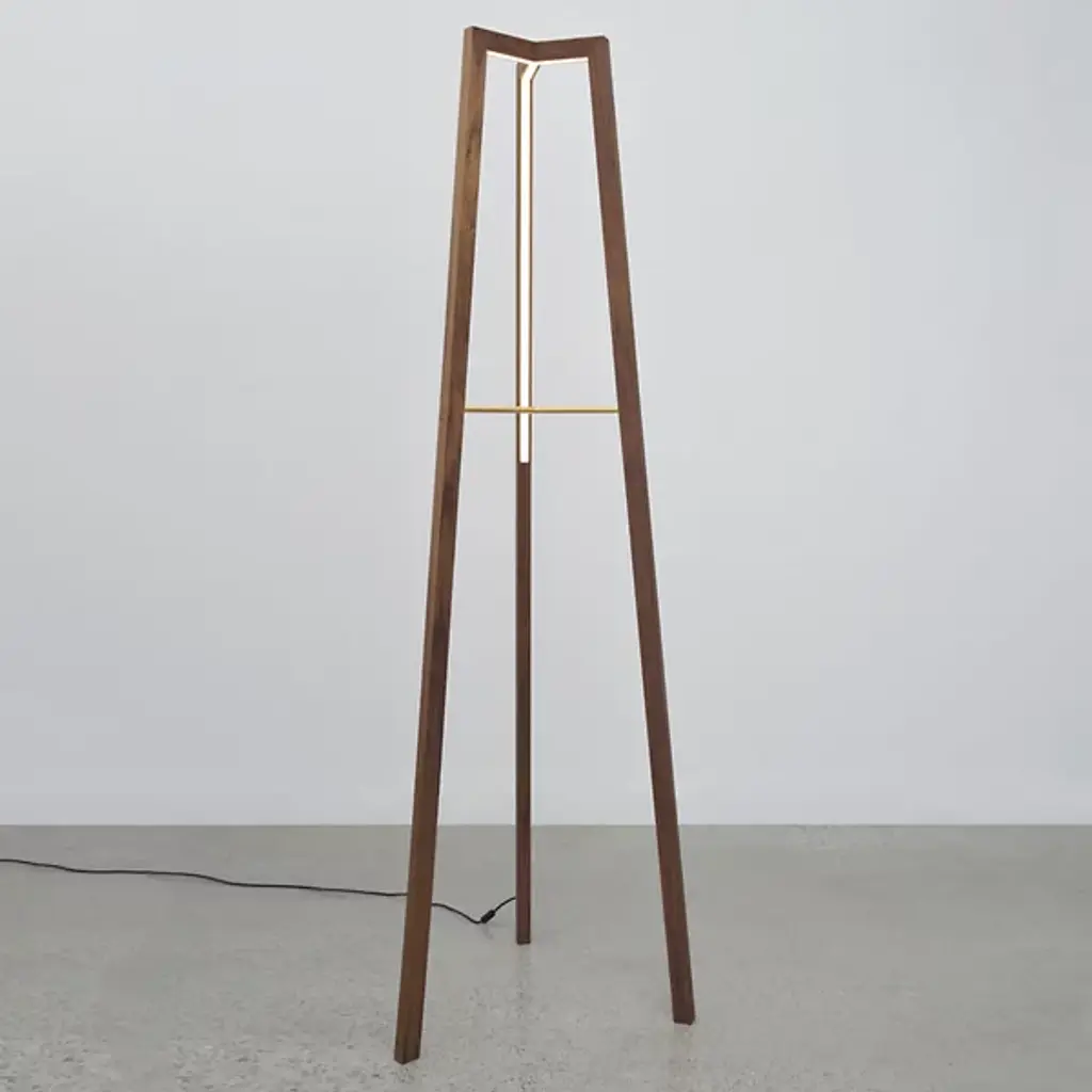 Accent your home with the elemental strength and beauty of the Junction LED Floor Lamp by hollis+morris. This fixture stands over six feet tall in a tripod formation crafted from natural wood legs. Its integrated LED light source illuminates frosted bands running along the interior of the piece, casting an ambient and inward glow. This fixture elegantly combines natural material with a clean, minimalistic design that brings an artful element to the home.