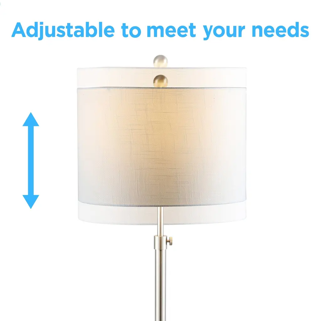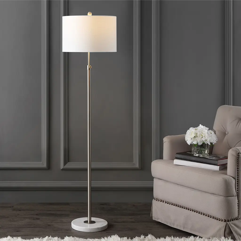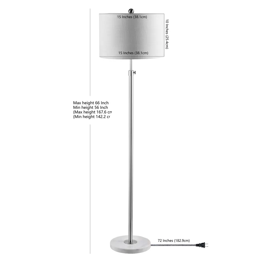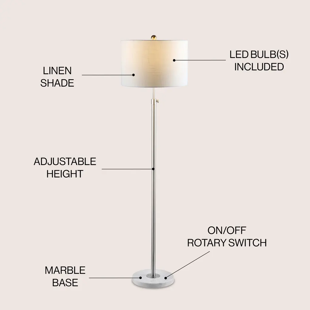 Cast a precise glow with this metal floor lamp's adjustable shade, which can move up and down 8" to align with the perfect height. The marble base provides a sturdy foundation to prevent tipping and a fun dose of style. Finished with a silk-wrapped cord, the details exhibit the luxury craftsmanship inherent in this design.Features:Dimensions:About us:You see a lamp.We see a decorative work of art.A perfectly curved shade casts a dramatic shadow on a floor. A silk cord you never want to hide. LED lightbulbs: as easy on the environment as they are on the eyes. The JONATHAN Y Lighting collection considers every detail from impeccably sourced materials to designer styling. And our prices are so attractive, we've transformed a functional necessity into a fashion accessory.JONATHAN Y Lighting … a fashion revolution in home décor.