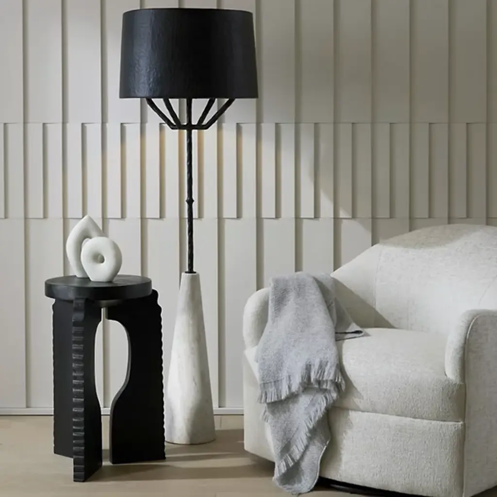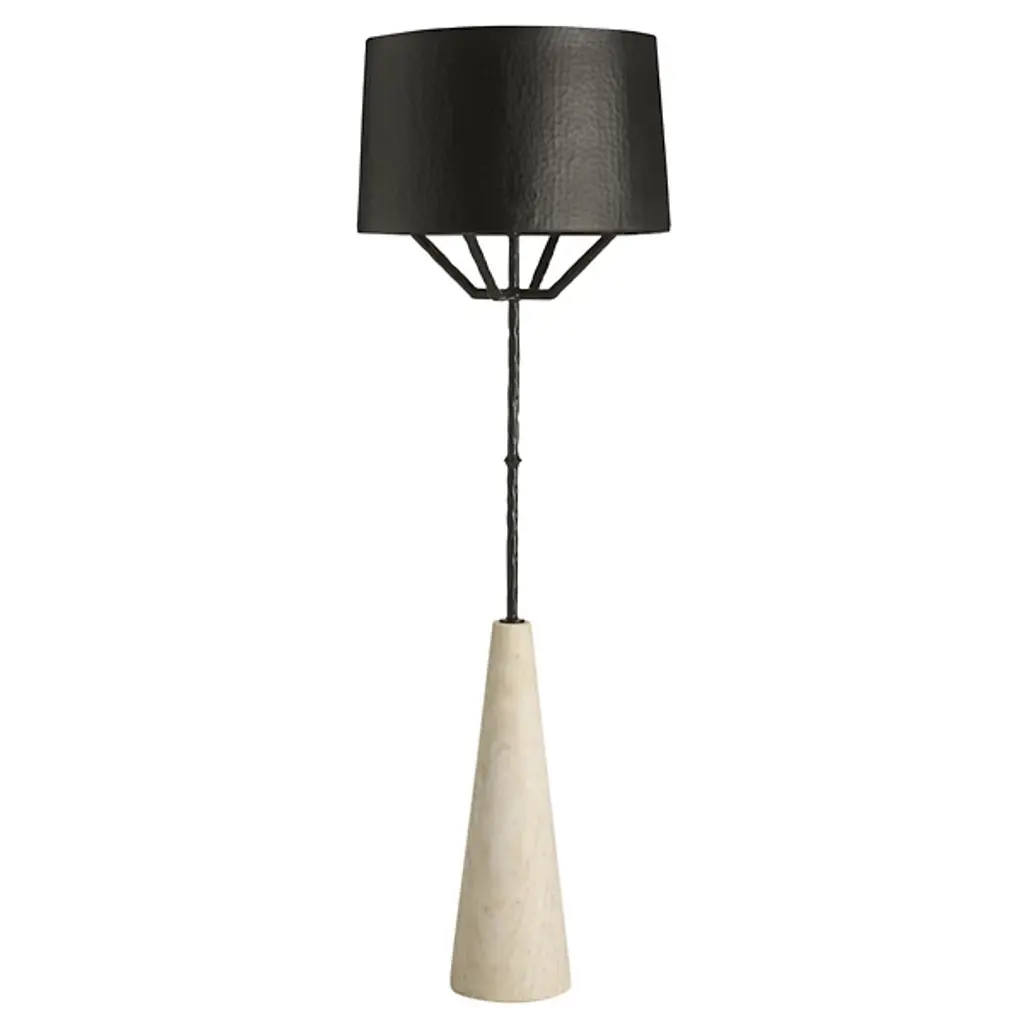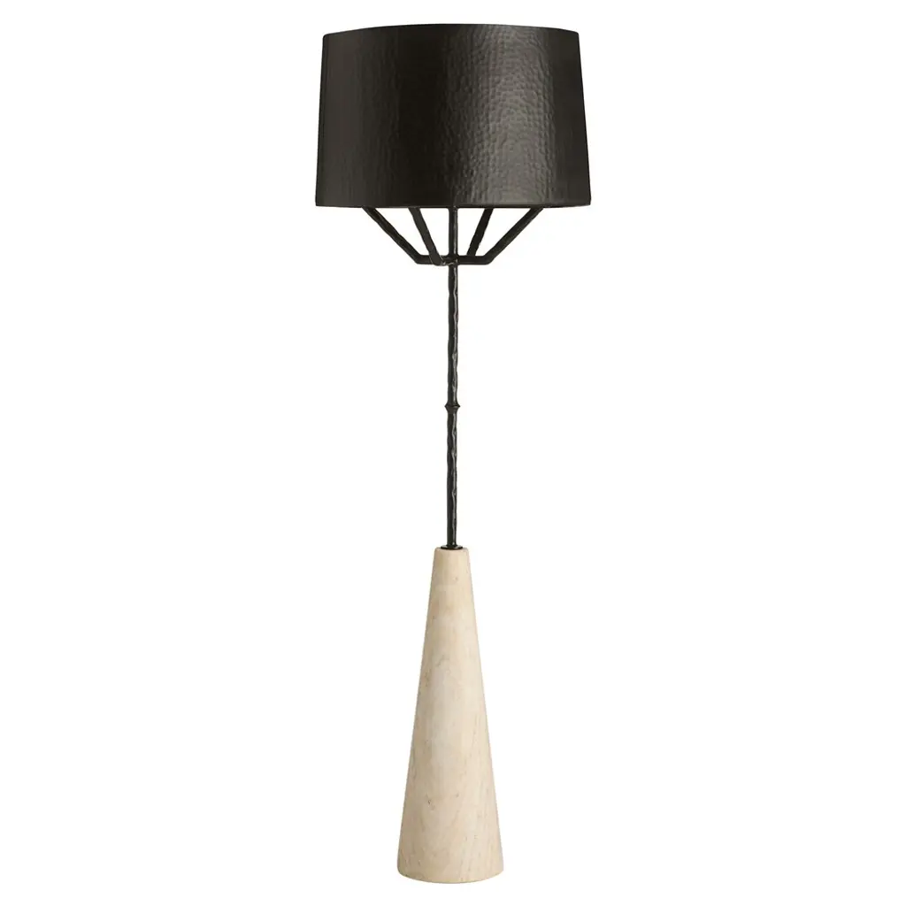 The Juneau Floor Lamp from Arteriors showcases innovative sculptural design through its forged natural iron construction paired with white marble accents. The conical base anchors the piece, while natural iron arms extend upward to support the matching shade in an architectural gesture. This industrial-inspired lamp works beautifully in modern lofts, contemporary living spaces, or anywhere bold sculptural lighting is needed. Forged iron construction brings authentic craftsmanship while marble elements add luxurious contrast to the raw metal framework.