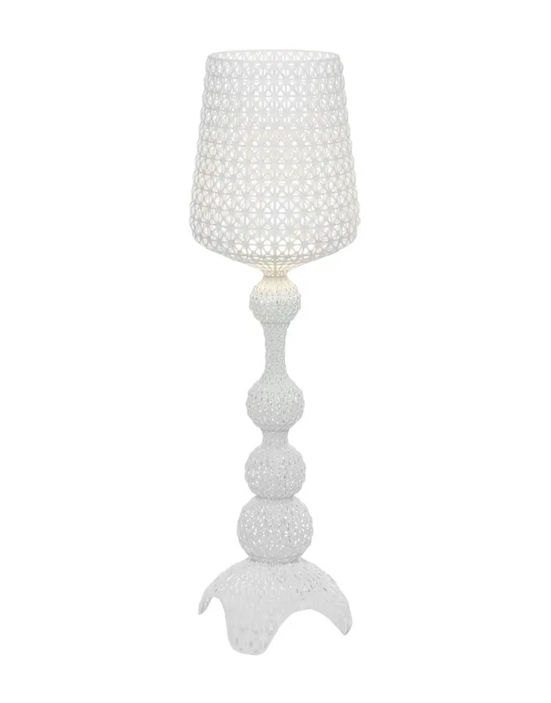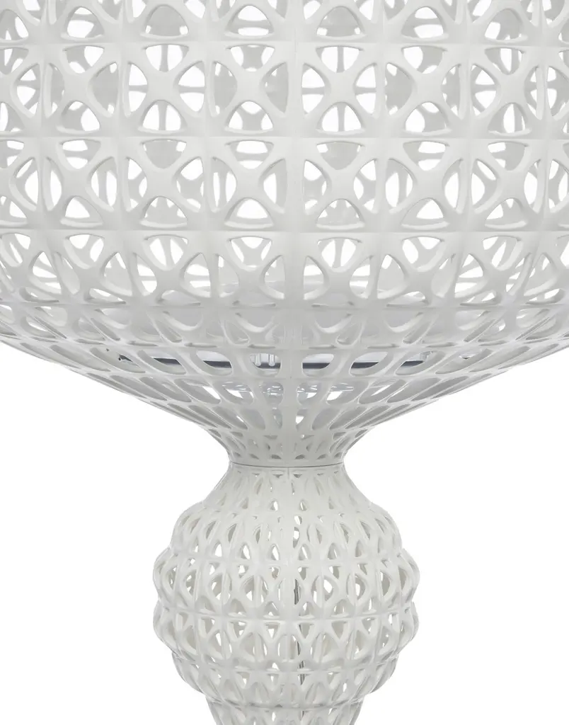 The Kabuki floor lamp is injection moulded. The technology used makes it possible to create a woven structure similar to lace with a unique perforated surface through which the light is diffused. Available in indoor and outdoor versions.