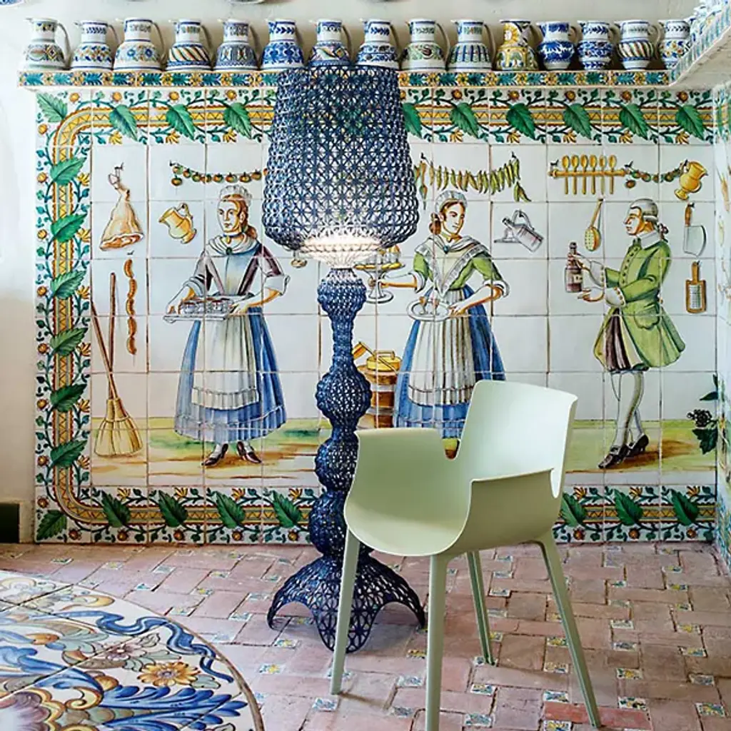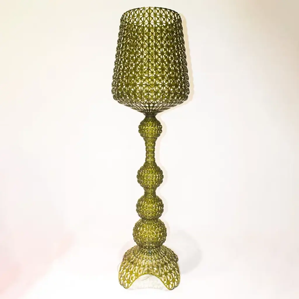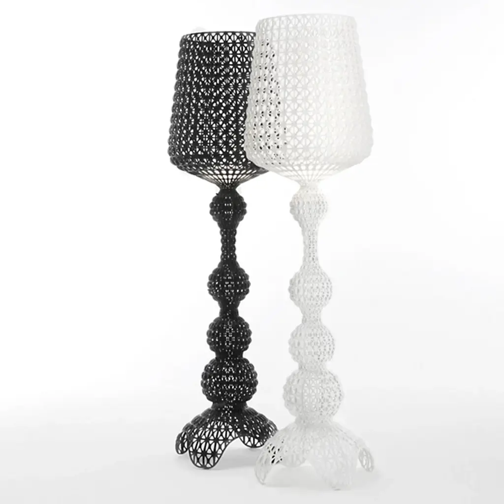 Ornate profile, modern construction. The Kabuki Floor Lamp by Kartell accentuates your space with its neo-baroque design by the day and intriguing glow by night. Designer and architect Ferruccio Laviani draws inspiration from the classical Japanese dance-drama known for its glamorous costumes to create this beautiful fixture that is crafted of thermoplastic technopolymer using injection molded technology. The top resembles a classic vase, while the bottom looks like a candlestick. When lit, the light filters through the woven lacy-like structure to create a visually striking lighting experience.