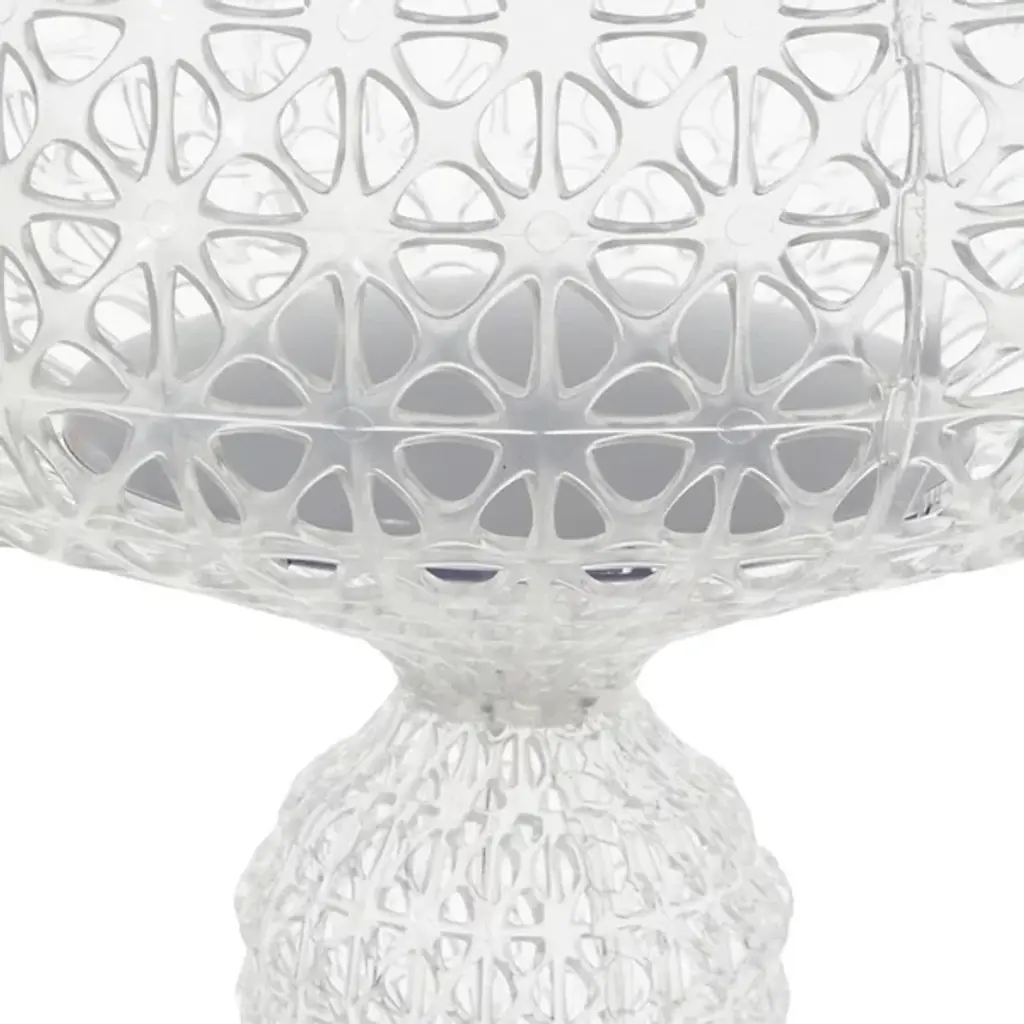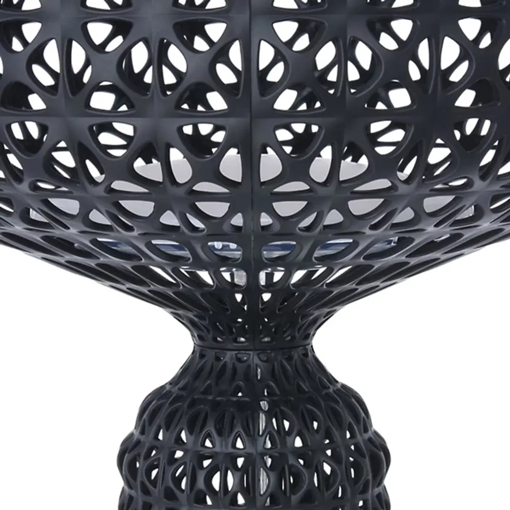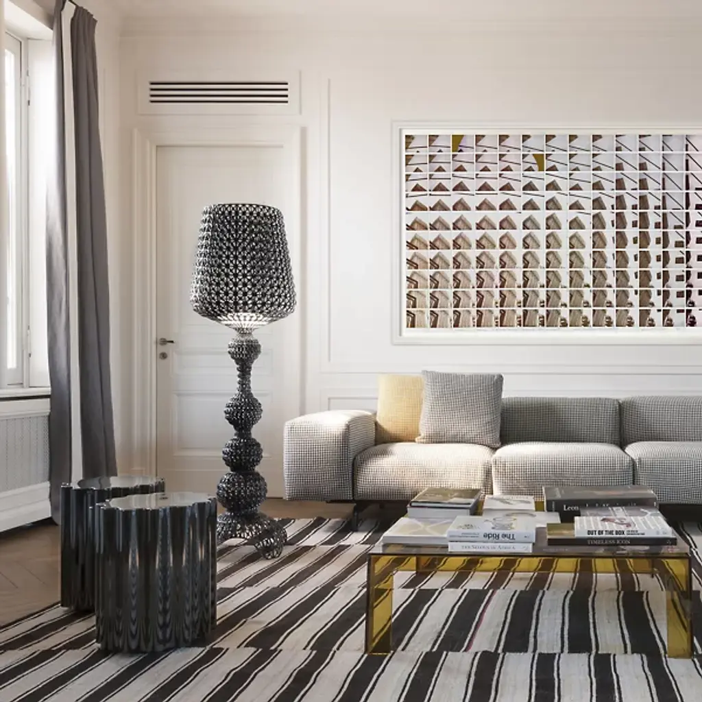 Ornate profile, modern construction. The Kabuki Floor Lamp by Kartell accentuates your space with its neo-baroque design by the day and intriguing glow by night. Designer and architect Ferruccio Laviani draws inspiration from the classical Japanese dance-drama known for its glamorous costumes to create this beautiful fixture that is crafted of thermoplastic technopolymer using injection molded technology. The top resembles a classic vase, while the bottom looks like a candlestick. When lit, the light filters through the woven lacy-like structure to create a visually striking lighting experience.