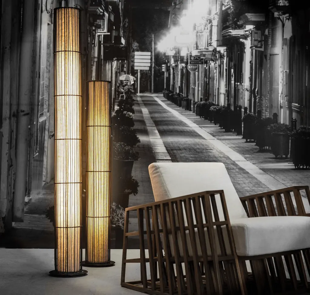 Let the warm light of the Kai collection lead you home. Buri woven over a light steel frame in a linear pattern creates a strong contrast against a handmade paper diffuser.
