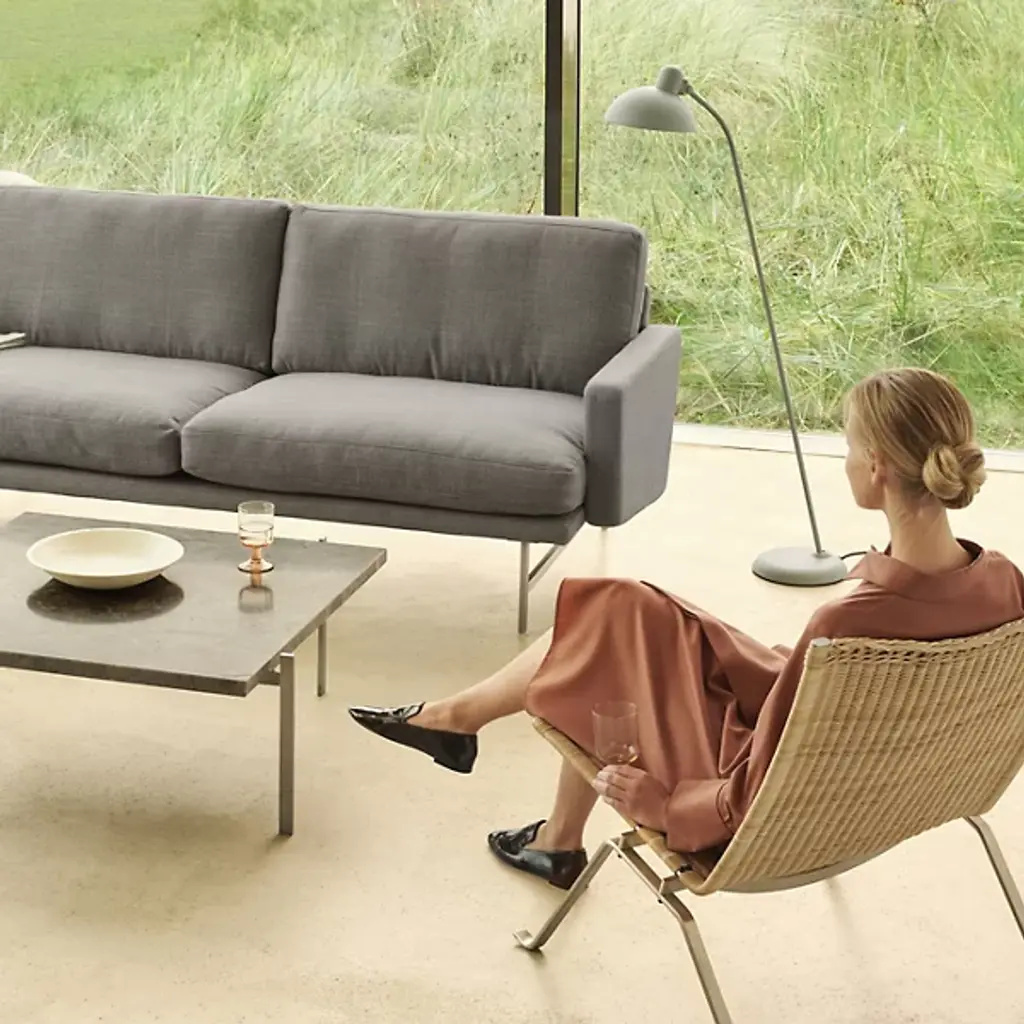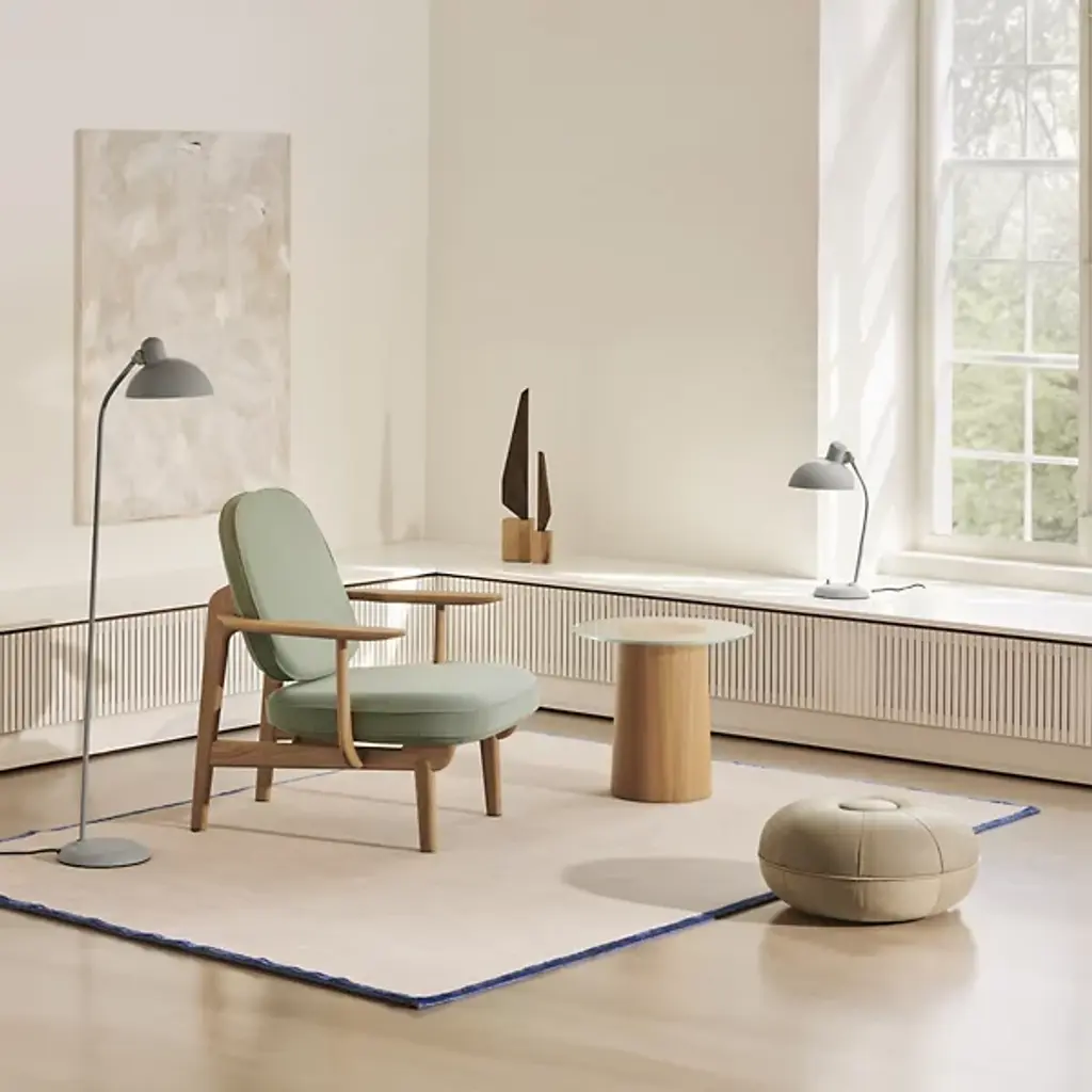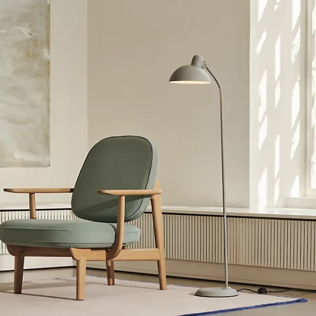 The Kaiser idell Floor Lamp from Fritz Hansen is designed by Christian Dell. Its design can be traced back to the 1930s, yet it remains contemporary to this day. It features a slender body that curves sinuously at the top, providing support for a sturdy shade of chrome-plated brass. Greenguard Certification represents a commitment to meeting strict low chemical emissions standards. This floor lamp is stabilized by a baseplate and is illuminated by an LED.