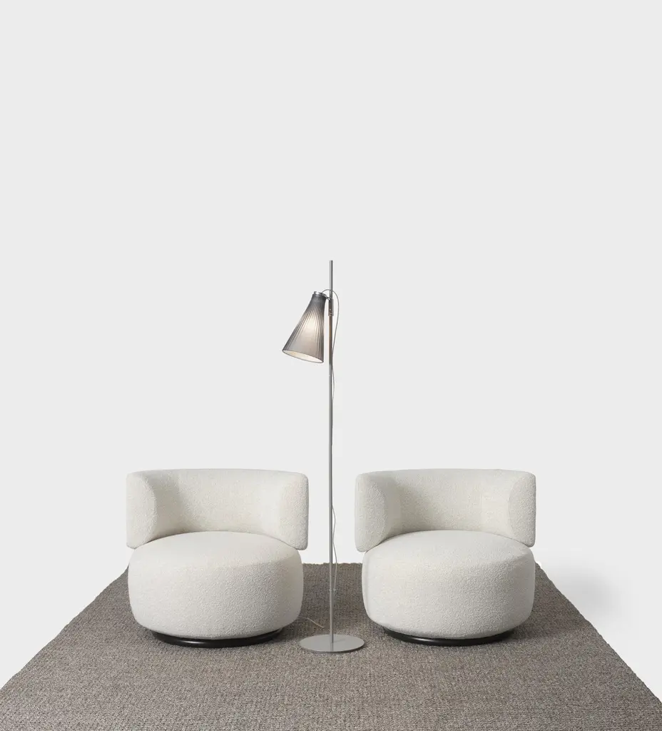 The K-LUX floor lamp stands out for the fascinating way in which it refracts light through specially formed, bi-injected plastic and for a two-coloured shade that is white inside and coloured outside. The lamp comes in six colour variants achieved by combining grey or black stands with smoke, green or straw yellow shades.