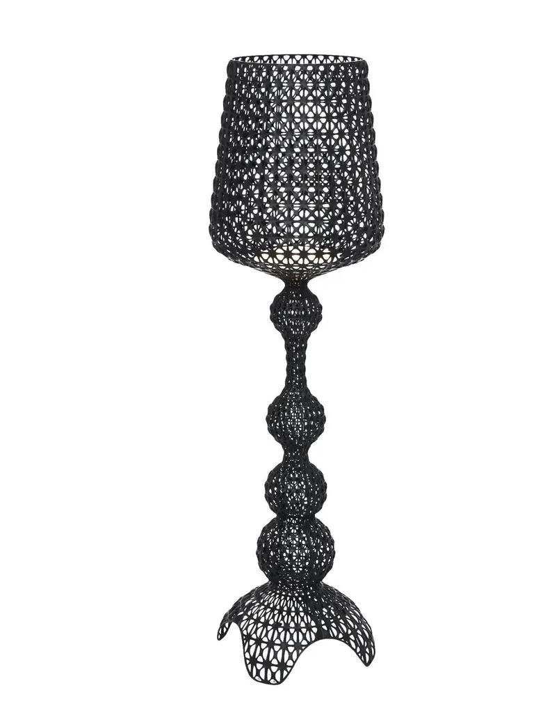 The Kabuki floor lamp is injection molded. The sophisticated injection technology used makes it possible to crate a woven structure similar to lace with a unique perforated surface through which the light is diffused.Dimensions: Height 65.33 in.; diameter: 19.67 in. Made of: Thermoplastic Technopolymer. Assembly required. Voltage: 120. Not adaptable for other countries. Integrated LED. Kelvins: 2700k. Bulb type: 26W LED.
