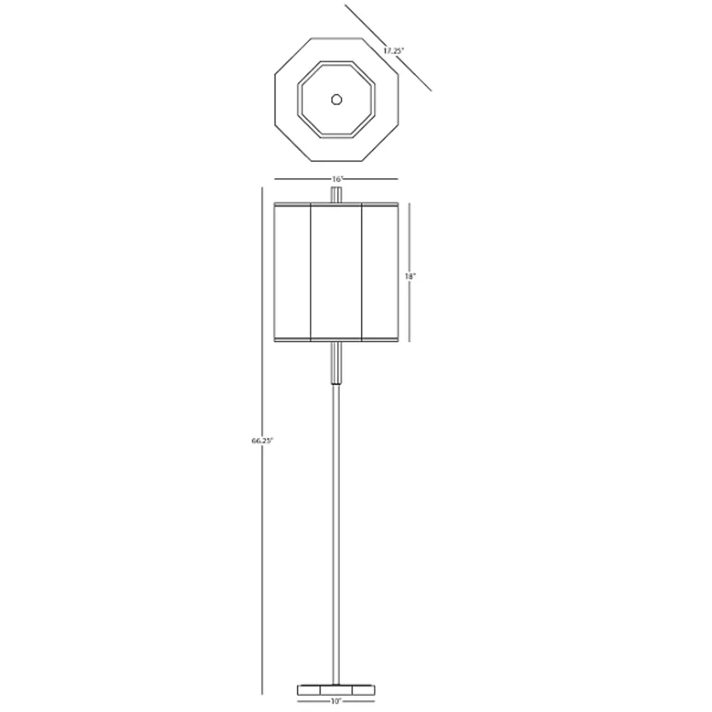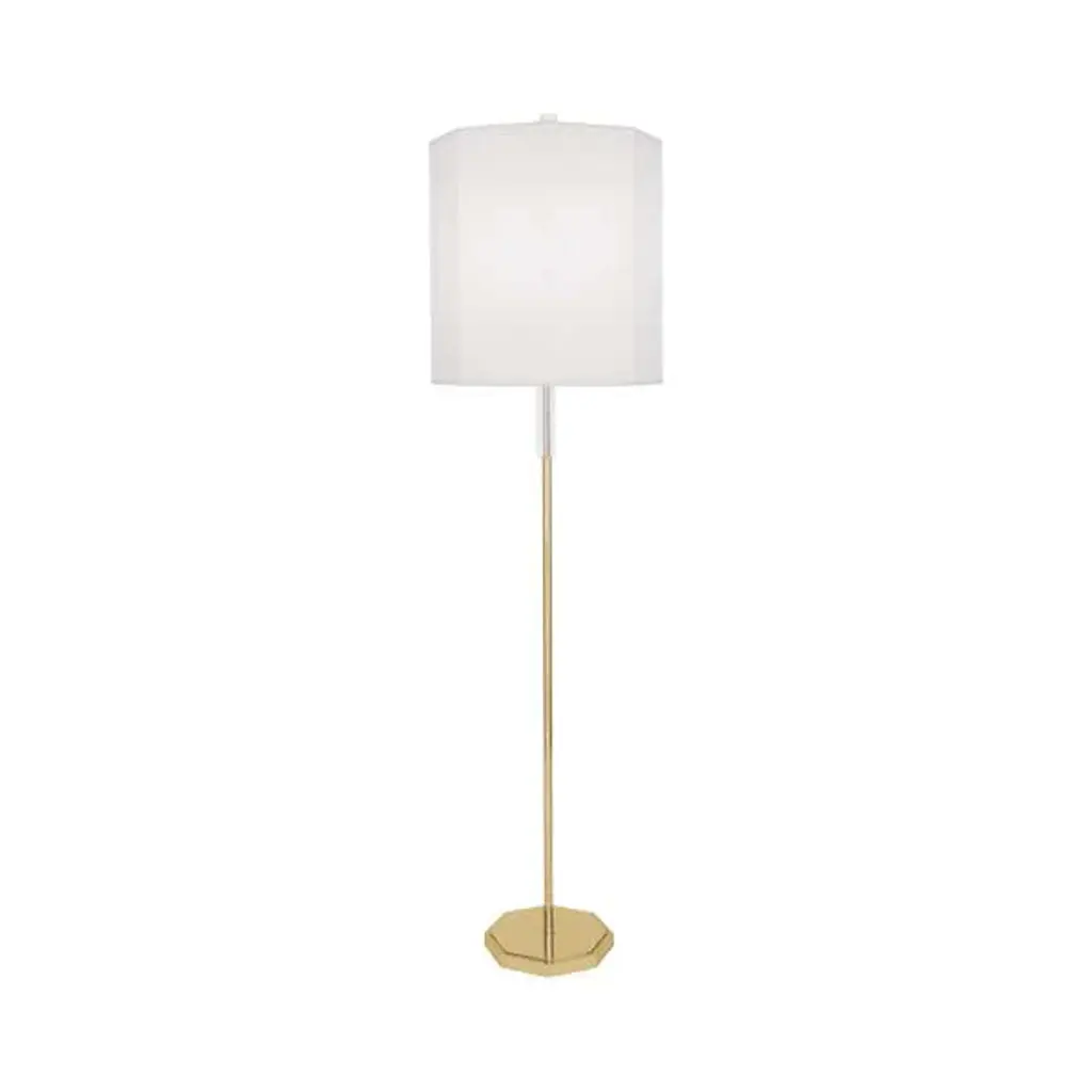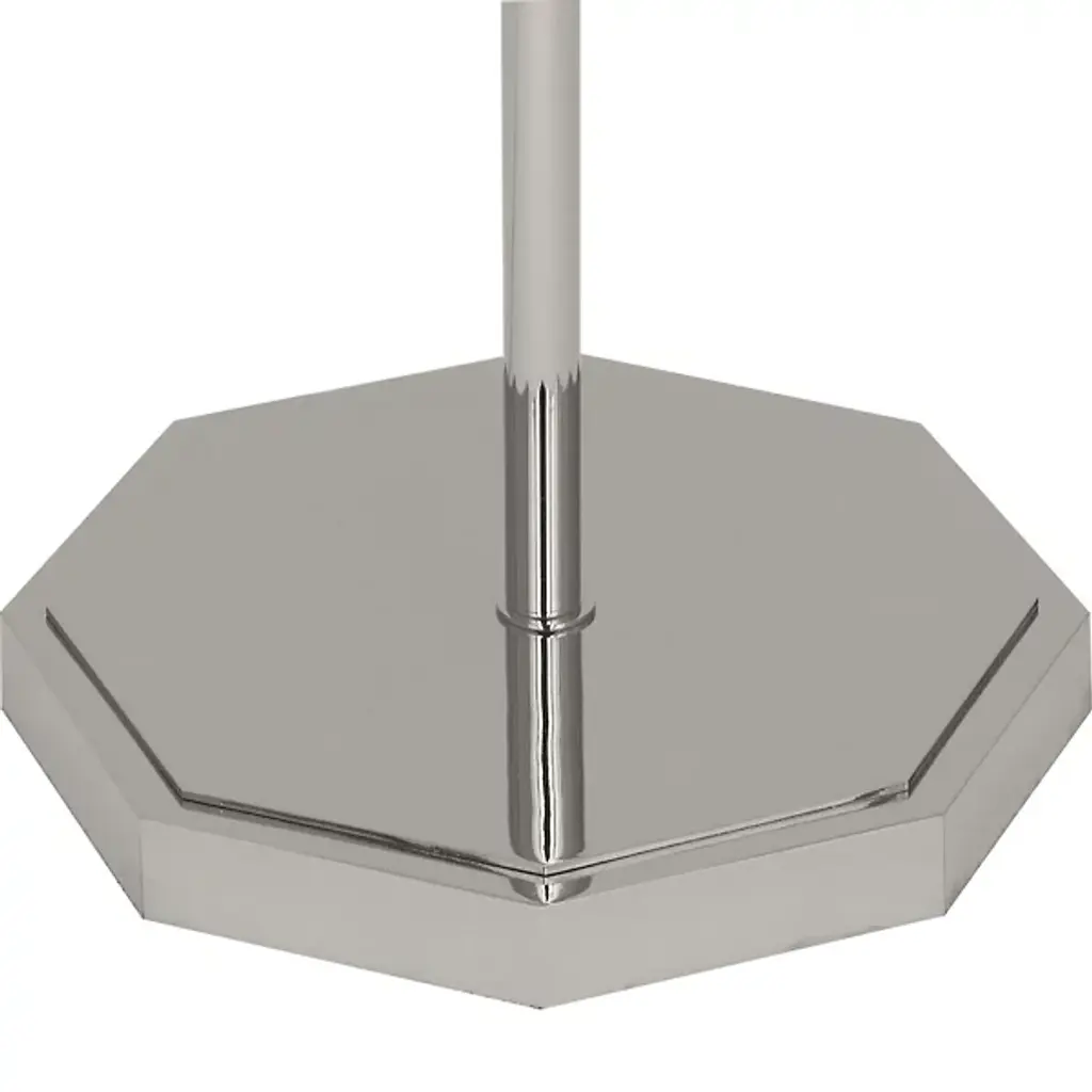 The Kate Floor Lamp from Robert Abbey is a sharp, modern piece designed with a subtle Art Deco-inspired touch. Its hardback fabric shade is held at the top of the piece by a slender metallic body. A matching circular base supports the lamp below. The angular shape of the shade offers a distinctive touch that brings an added element of style to an otherwise simplistic and straightforward aesthetic. Its light is gently filtered in every direction, creating a warm and welcoming tone for the room.