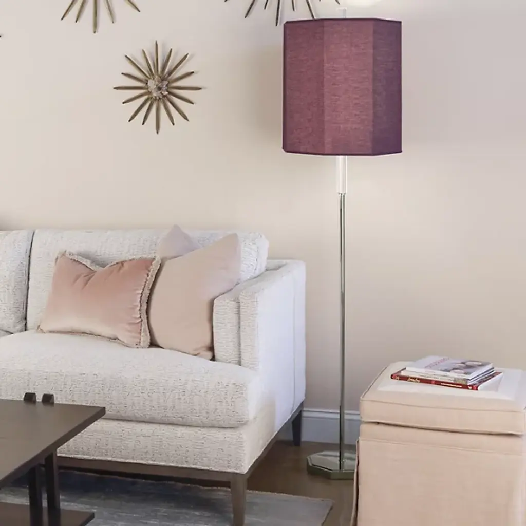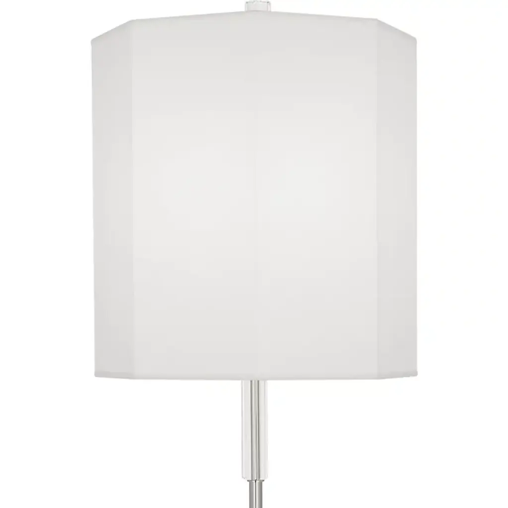 The Kate Floor Lamp from Robert Abbey is a sharp, modern piece designed with a subtle Art Deco-inspired touch. Its hardback fabric shade is held at the top of the piece by a slender metallic body. A matching circular base supports the lamp below. The angular shape of the shade offers a distinctive touch that brings an added element of style to an otherwise simplistic and straightforward aesthetic. Its light is gently filtered in every direction, creating a warm and welcoming tone for the room.