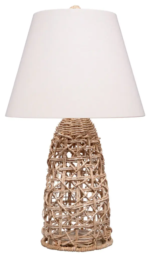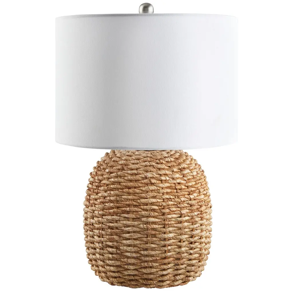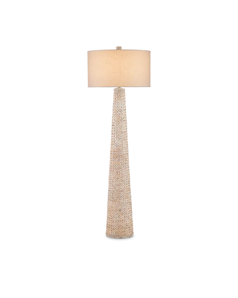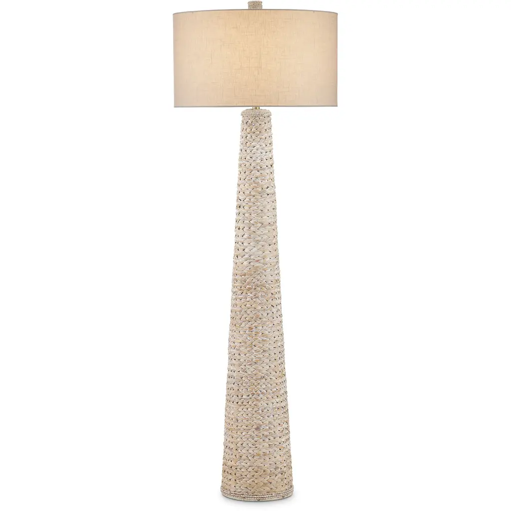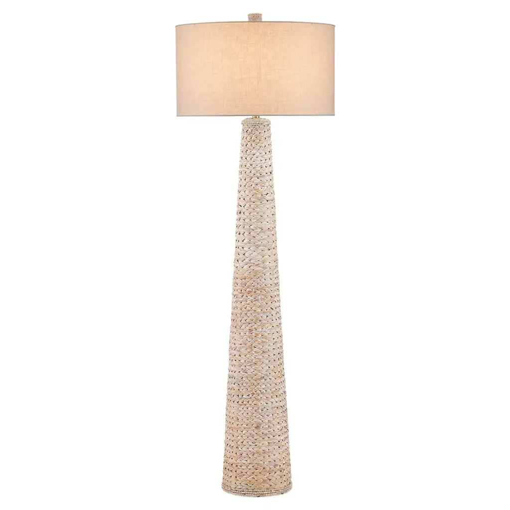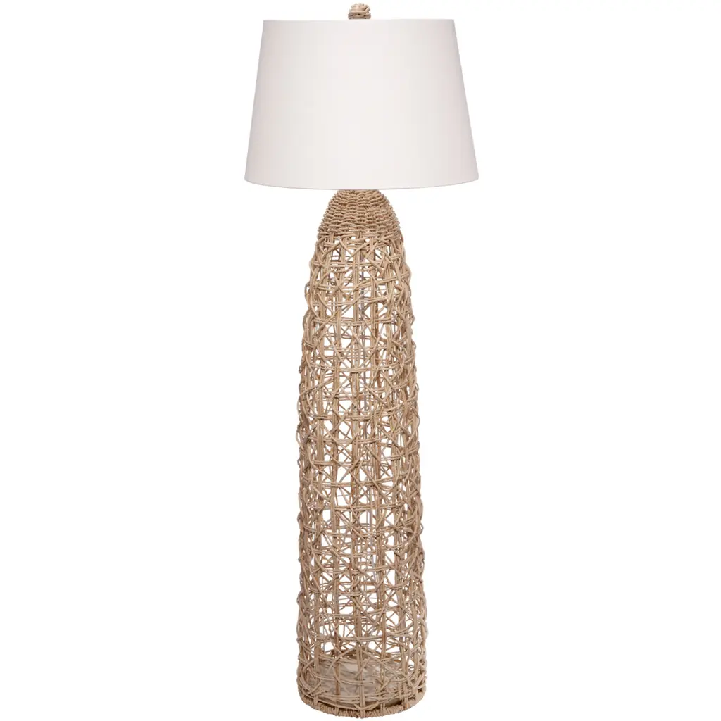 The Kaui Floor Lamp from Jamie Young Co. invites one to think of an idyllic island getaway in the sun with a hand-made coastal design inspired by Hawaiian vibes. This tall, prominent luminaire sets an elevated and relaxed tone. An alternating woven pattern adds interest to the body's rounded tapering shape. This crisscross pattern of corn rope feels light, airy, and full of fresh style. Light eases out the drum shade as a calm aura.