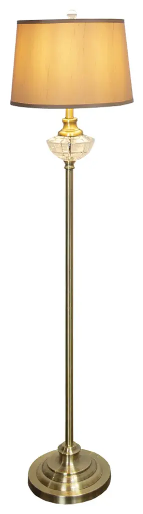 Our warm Kayla Crystal Floor Lamp is a sumptuous addition to any decor style. The tall fixture features a metal base, finished in rich Golden Antique Brass that touts a stepped round pedestal and smooth center column. At the top of the column sits a break crafted of 24% lead hand cut crystal. We topped that with a metal vase cap, finished to match in Golden Antique Brass and paired it with a sleek shade in natural hard back fabric and crystal finial that perfectly complements the base finish and directs the lamplight down over the crystal where it is reflected outward into the room for a warm glistening effect. Wired to accept a 150W 3-way light bulb (not included) our Kayla Crystal Floor Lamp makes a wonderful reading lamp that is simply spectacular when displayed in pairs next to a sofa or bedside. Socket: 3-WayNumber of Bulbs: 1Bulb Type: Med Base - E26Wattage: 150WSwitch: Turn KnobBulbs Included: No