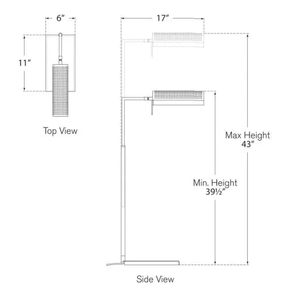 Precision Pharmacy Floor Lamp in Polished Nickel with White Glass Designer: Kelly Wearstler Height: 39.5" - 43" Shade Detail: White Glass Extension: 17" Base: 6" x 11" Rectangle Socket: E17 Keyless w/ Dimmer on Cord Wattage: 9 LED T6.5 Safety Rating Location: DRY Note: Bulb Included