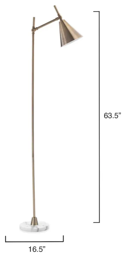 Introduce a mid-century modern mood to your home with this distinctive floor lamp. Crafted of iron and anchored in a luxe marble base, this lamp features an adjustable arm. Practical and the perfect answer for a nook in need of task lighting. Crafted of Iron and hand-finished in BrassMatching Metal ShadeMarble White BasePlug-InThe inherent variations in tone and texture of iron and marble are preserved, to create pieces rich in detail and natural beauty. These unique imperfections give our products character and individuality, with each piece having its own personality. These unique imperfections and variations are what define our products, with each piece having its own personality. Lamp Dimensions: 63.5"H x 16.5"W x 16.5"D, Footprint Diameter 8.75"Hood Dimensions: 7"H x 7" Diam.1 bulb required; Bulb Not Included60 Max Wattage; Volts 120E26 Bulb Base Type 8 Ft Clear CordOn/Off Foot SwitchCare Instructions: We do not recommend using harsh or abrasive cleaners at any time as they can damage product. Wipe surfaces gently with soft, dry cloth. If needed, you may use a lightly damp cloth with water only on base.