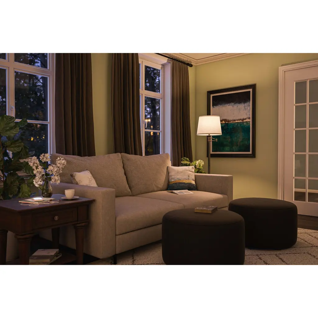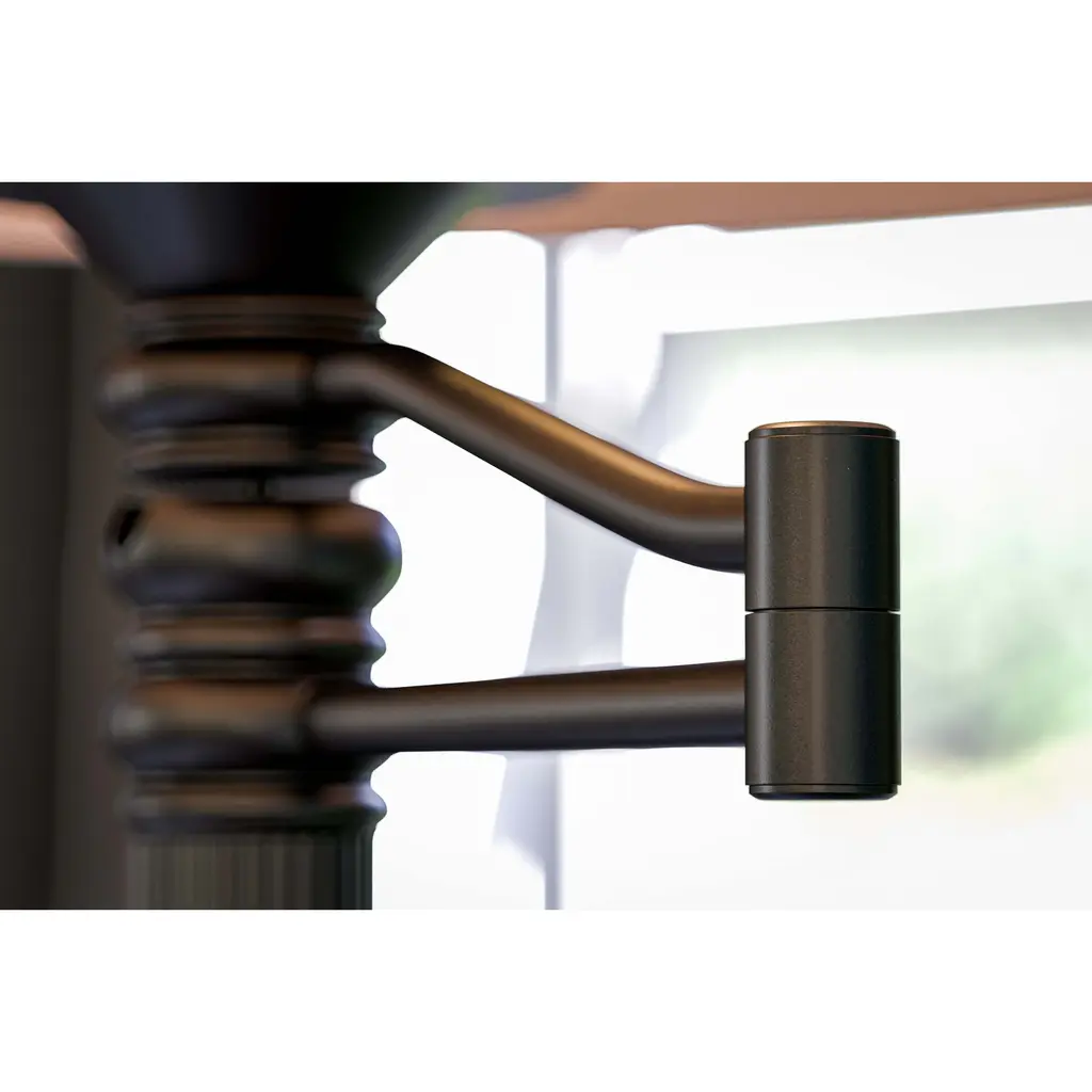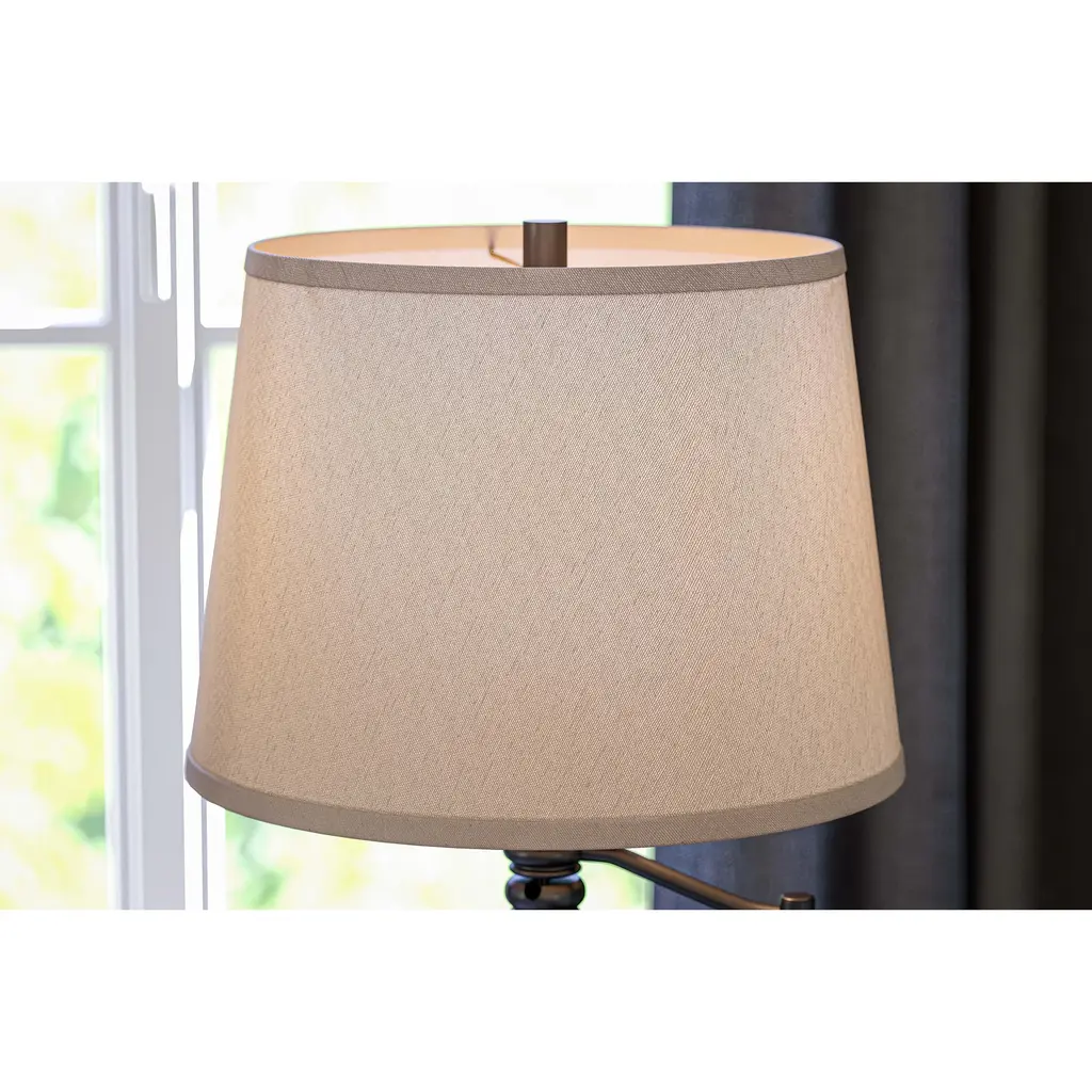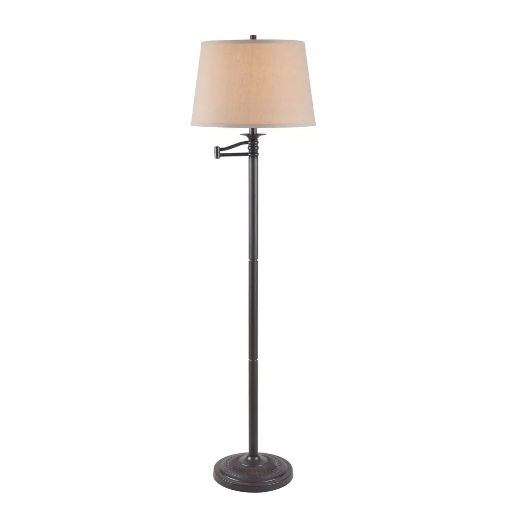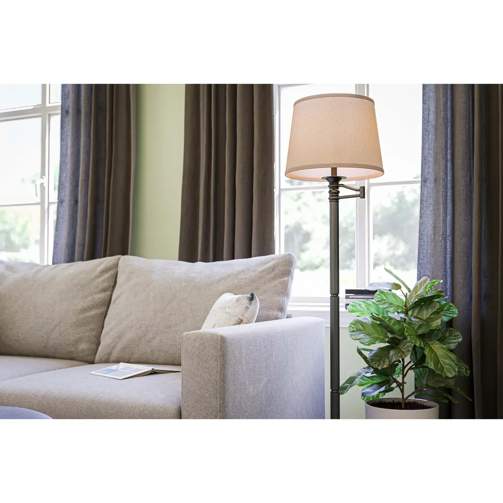 This floor lamp's traditional reeded candlestick base is brought up to date by an oatmeal tapered drum shade and the unique warm tones in its copper bronze finish. With a wide range of motion thanks to its swing arm construction, this floor lamp provides easy and accessible illumination options, simply position the swing arm where you need it, when you need it and tuck it away when your task is complete. With a slim profile perfect for tucking behind furniture, this floor lamp is perfect for minimalist living rooms or small space apartments thanks to its function-forward design and stylish classic looks.Traditional swing arm floor lamp combines modern function with timeless styleWarm copper bronze finish creates an inviting, traditional lookOatmeal tapered drum shade creates a gentle, room-filling glow - perfect for use as a reading lightFully adjustable swing arm reaches 24 inches, allowing you to place the lighting element wherever you need it59-inch height and swing arm function makes this floor lamp perfect for placement behind furniture or beside any sofa, loveseat, accent chair or deskShade Dimensions: 16 inches depth x 16 inches width x 10.38 inches heightCord Length: 72 inchesSocket Quantity: 1Bulb Shape: A19Socket Type: E26Light Bulb Type: Replaceable LEDLight Bulb Included: NoVoltage: 120Fixture Dimmable: Yes