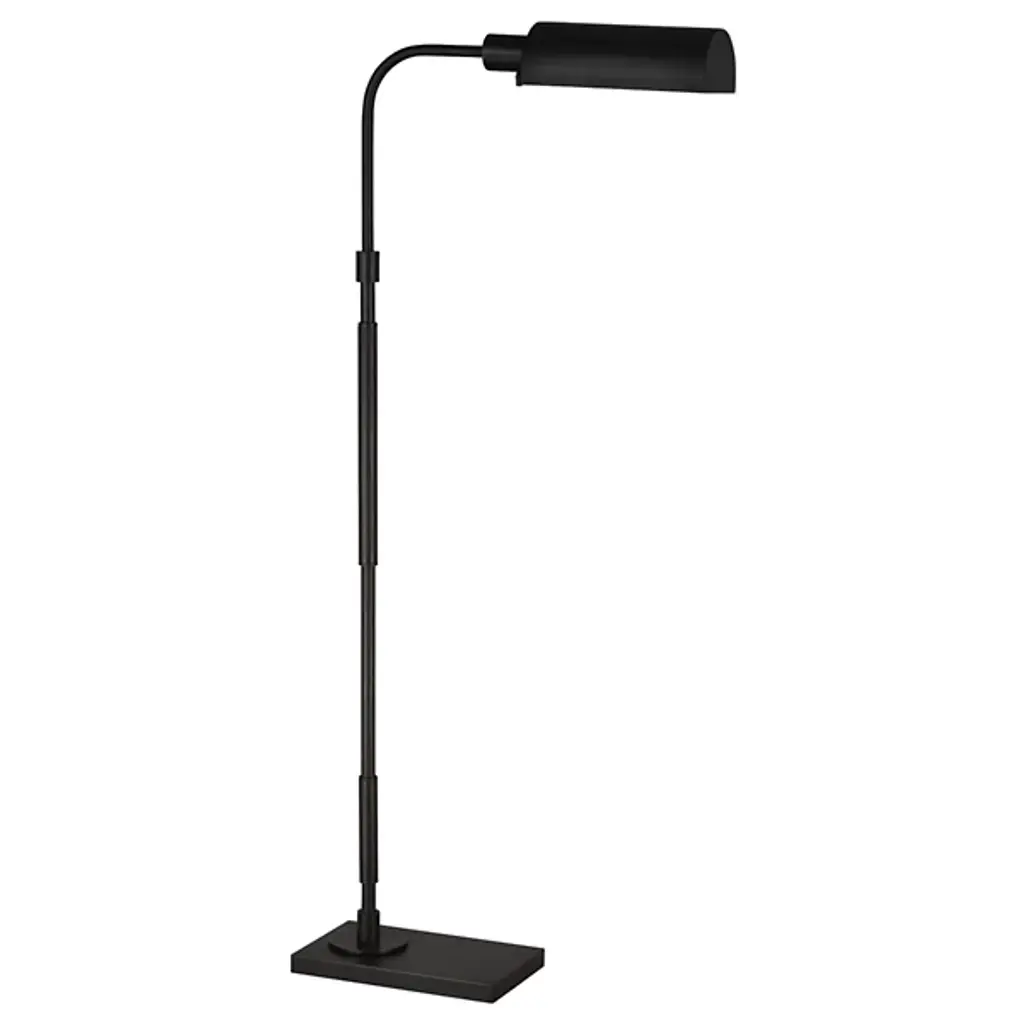 The Kenyon Task Floor Lamp from Visual Comfort Studio, formerly known as Chapman & Myers, presents a smooth contemporary style with an elegant, adjustable presentation. A swooping steel structure secured by a rectangular base, it uses a contoured, offset stem to suspend a curving arm that sweeps up and over, extending a strong single socket lamp inside a curving, half-cylinder shade. An excellent choice for reading or task lighting, the shade’s open base channels a focused wash of light beneath the fixture, adding an inspired warmth to its surroundings.