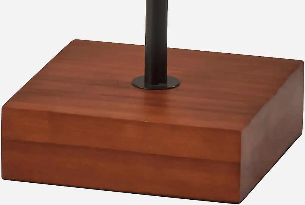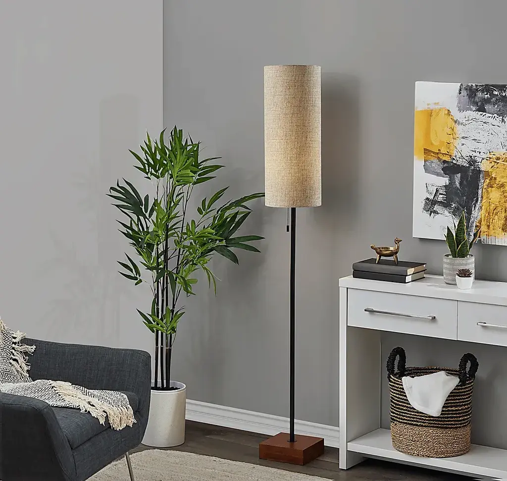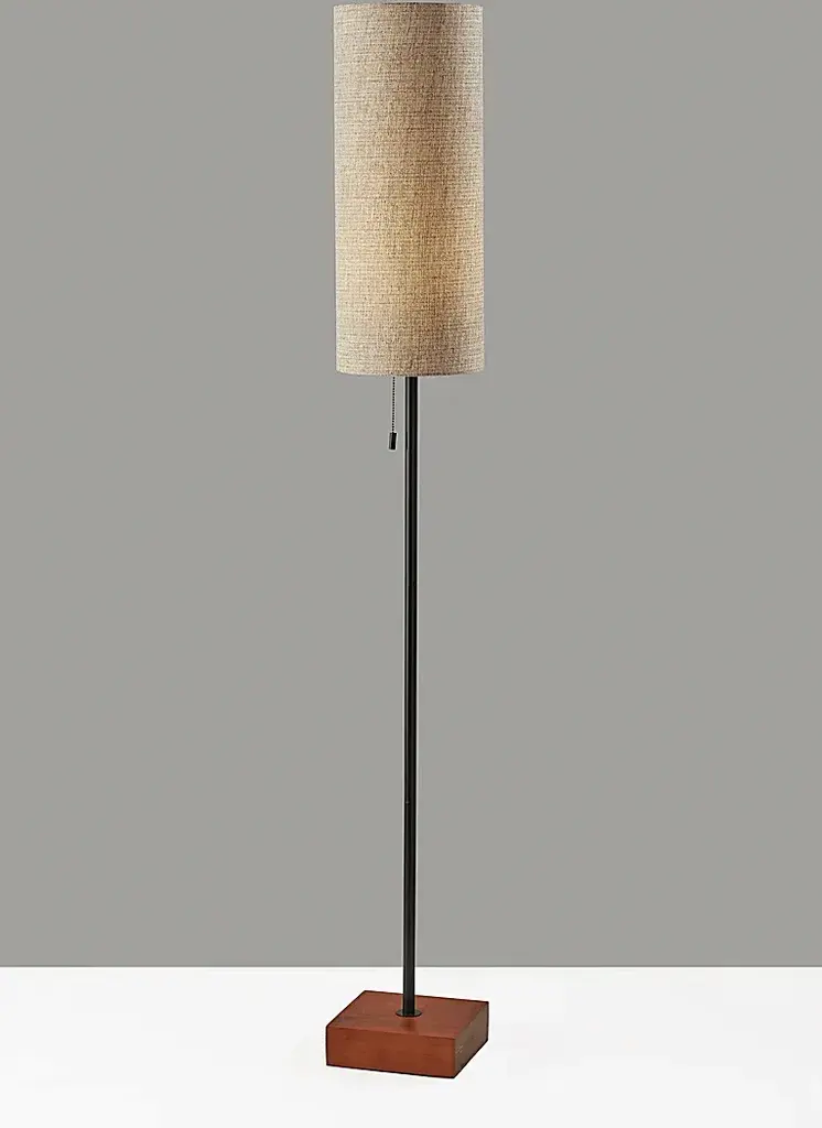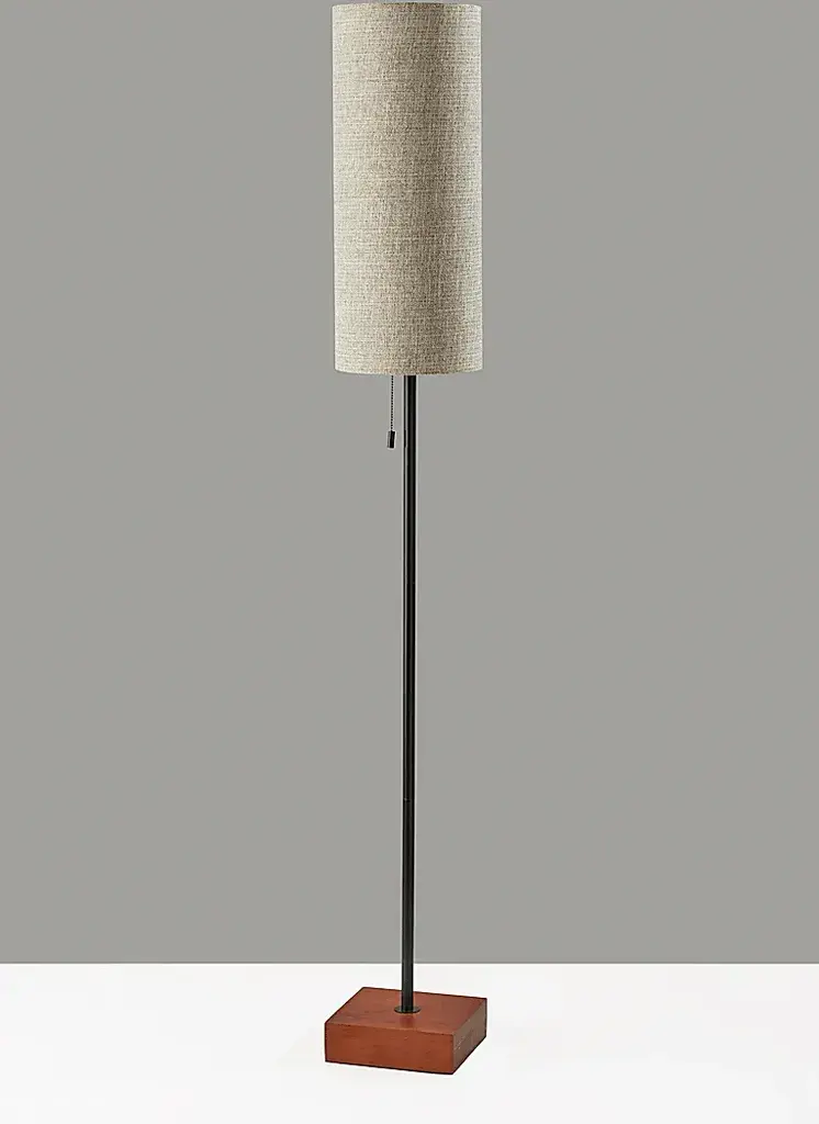Illuminate your space in a stylish blend of neutral colors with the 62 tall Andreola floor lamp. This modern lamp artfully mixes materials and shapes, with a cube-shaped base in a warm walnut finish, a thin black stem, and tall drum-shaped shade. The beige and brown textured fabric shade softly distills light from the 100W bulb not included. Operated by a black metal pull chain switch that matches the stem, the table lamp also features a 6' brown cord. Customer assembly required.