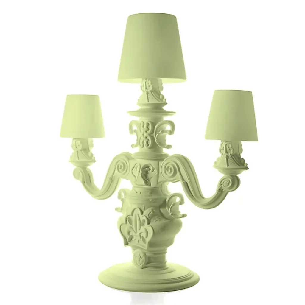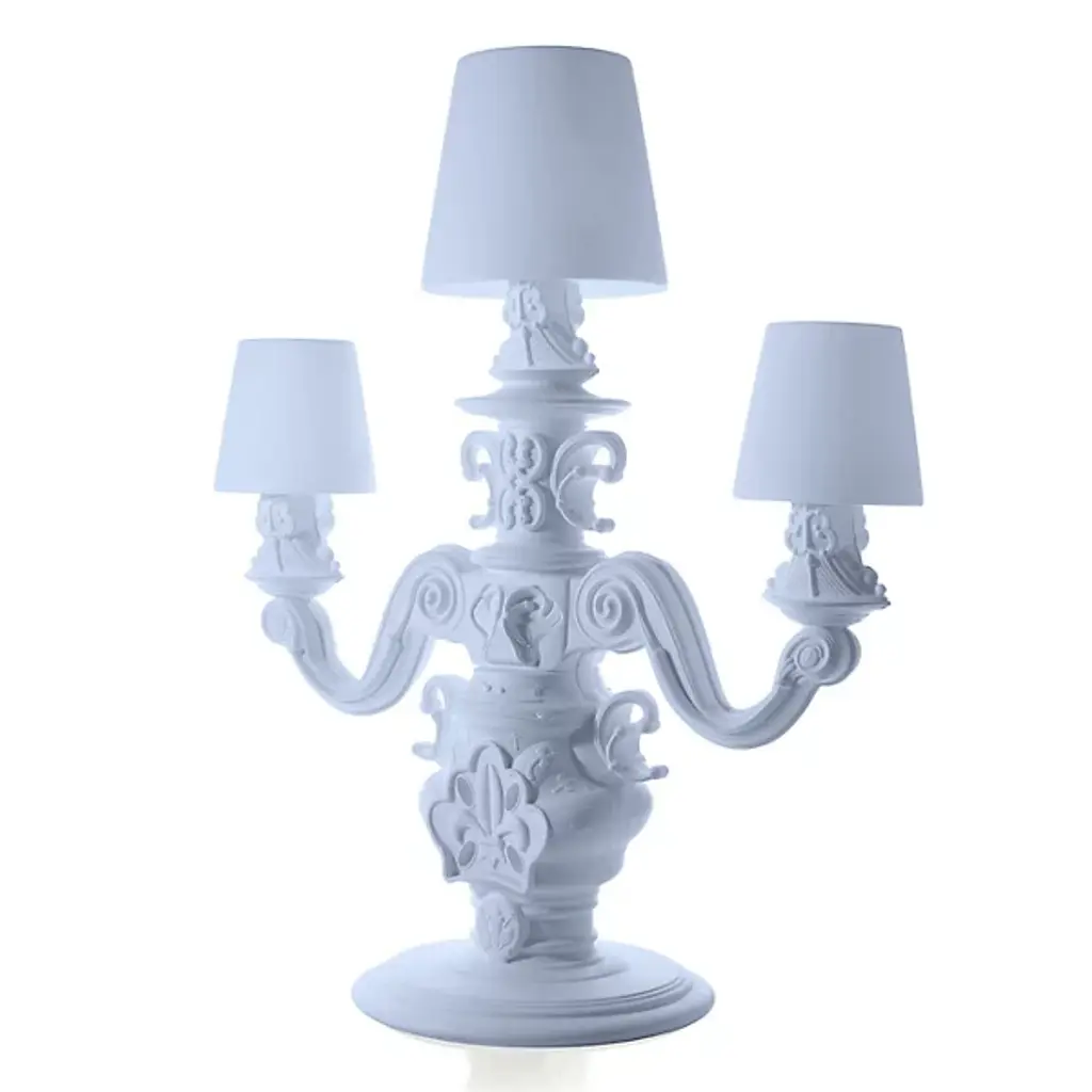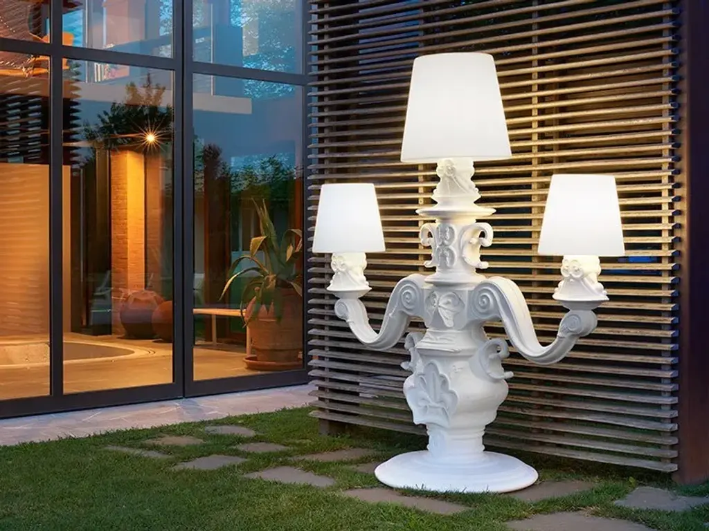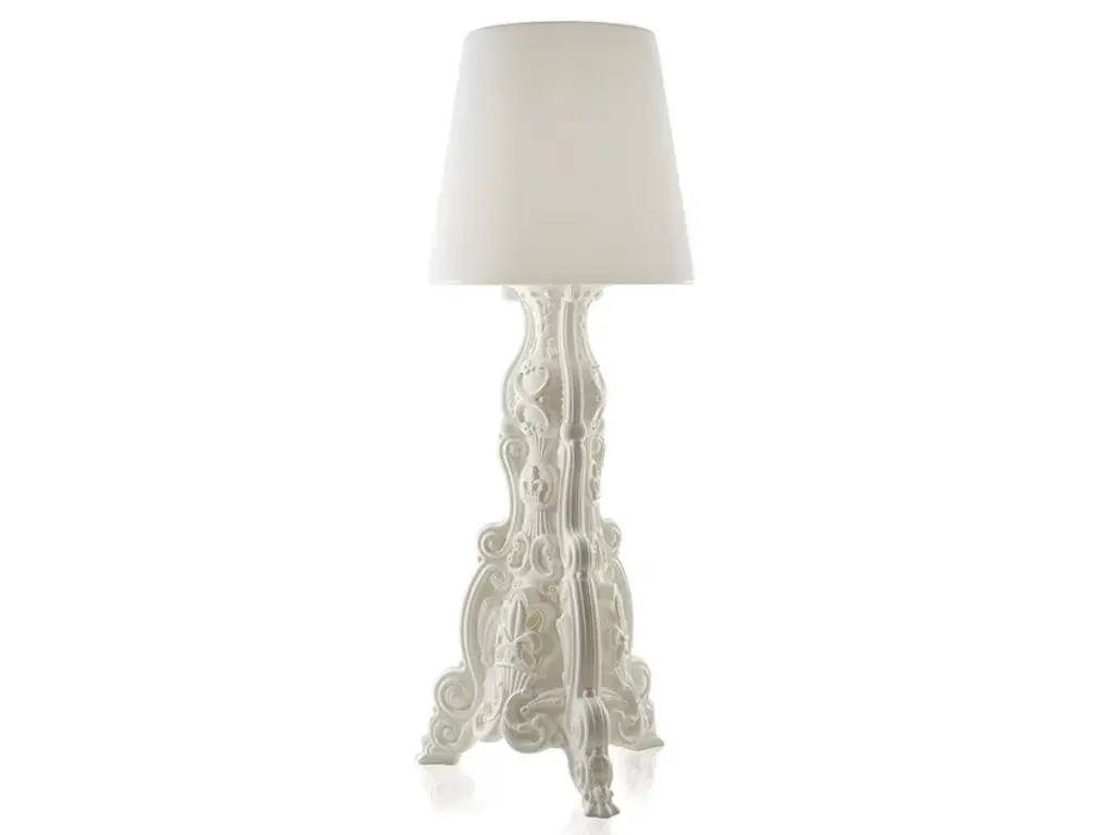 King of Love is a majestic floor lamp that gets the area it occupies. Graziano Moro and Renato Pigatti make richer the Design of Love collection with King of Love floor lamp: its stem reminds baroque style, while the three bright white luminous lampshades are embellished with a classic texture to obtain a sophisticated, elegant and pleasing decor. King of Love is made in polyethylene and this material gives to it an ironic and pop style, as the whole Design of Love collection.Lamp body finish:- Standard color- Glossy lacquered- Matt lacqueredStandard version light sources- E27 - 2 x 10W + 1 x 15W- RGBW LED includedLacquered version light sources2 x 10W - A65 / E271 x 15W - G95 / E27
