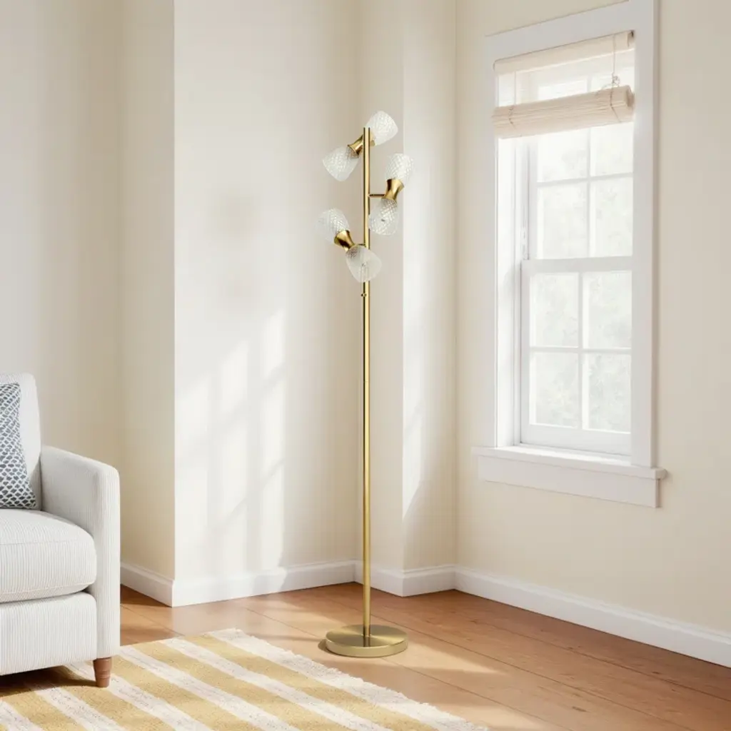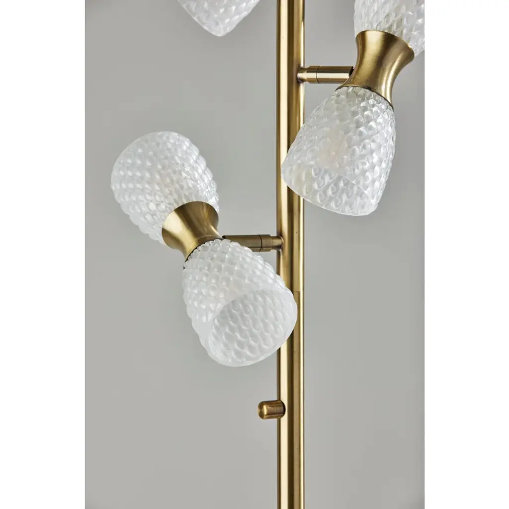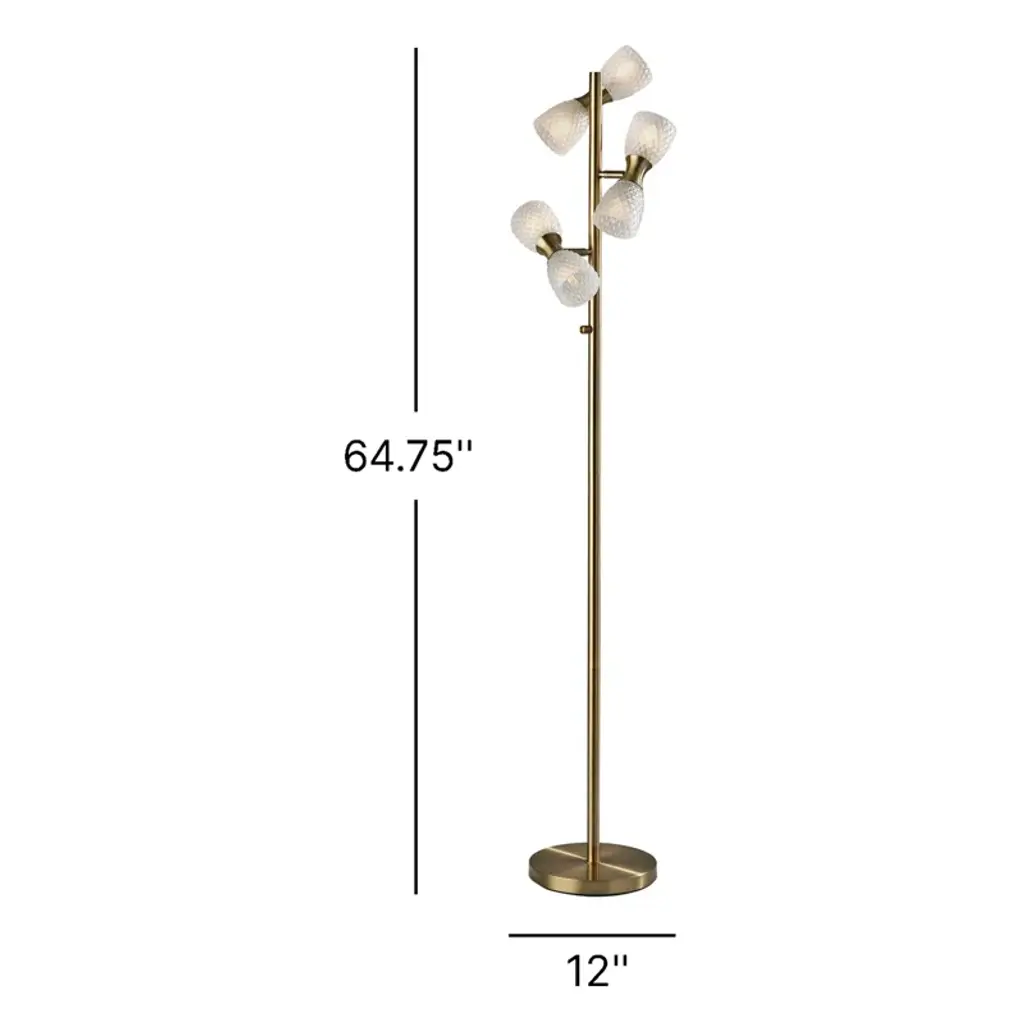 Illuminate your space with a touch of vintage charm using this six-light floor lamp. Made from solid brass with an antique finish, it features a rotary socket switch for easy control. Each light is adorned with a cone-shaped textured milk glass shade, creating a warm and inviting ambiance. The floor lamp is designed for dry locations and comes with energy-efficient LED bulbs. Ideal for adding a cozy glow to your living room or reading nook, this floor lamp is both functional and fashionable.