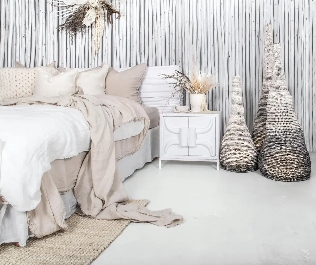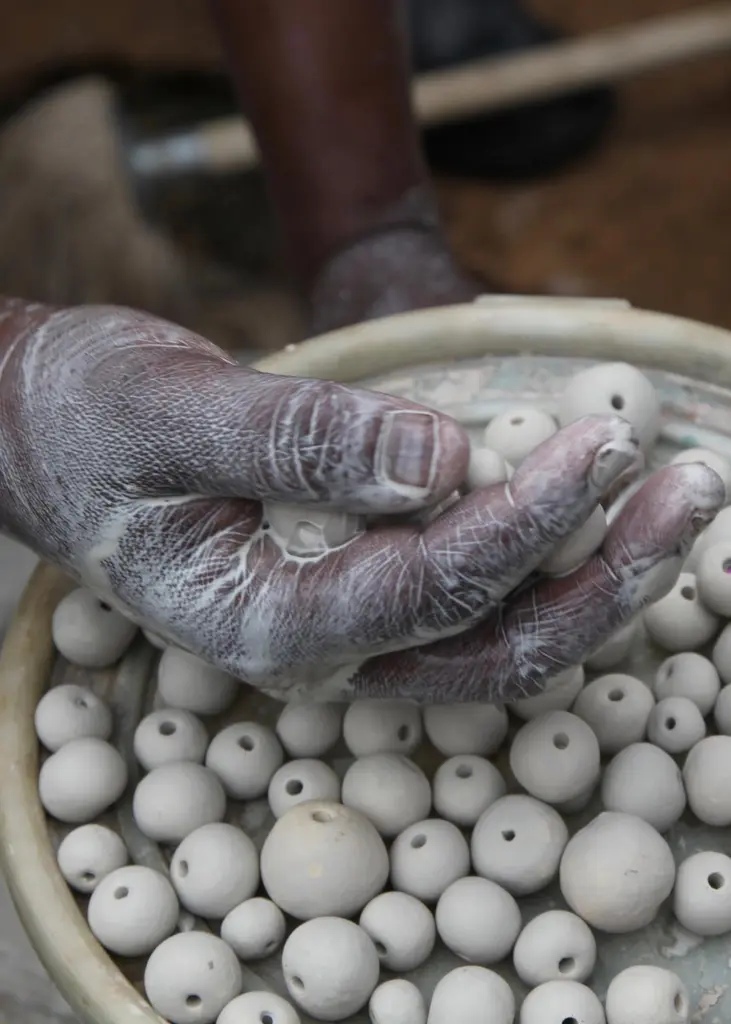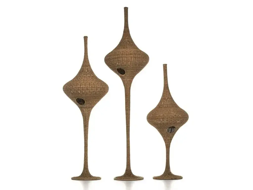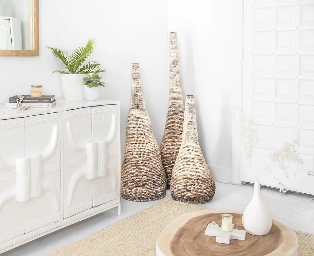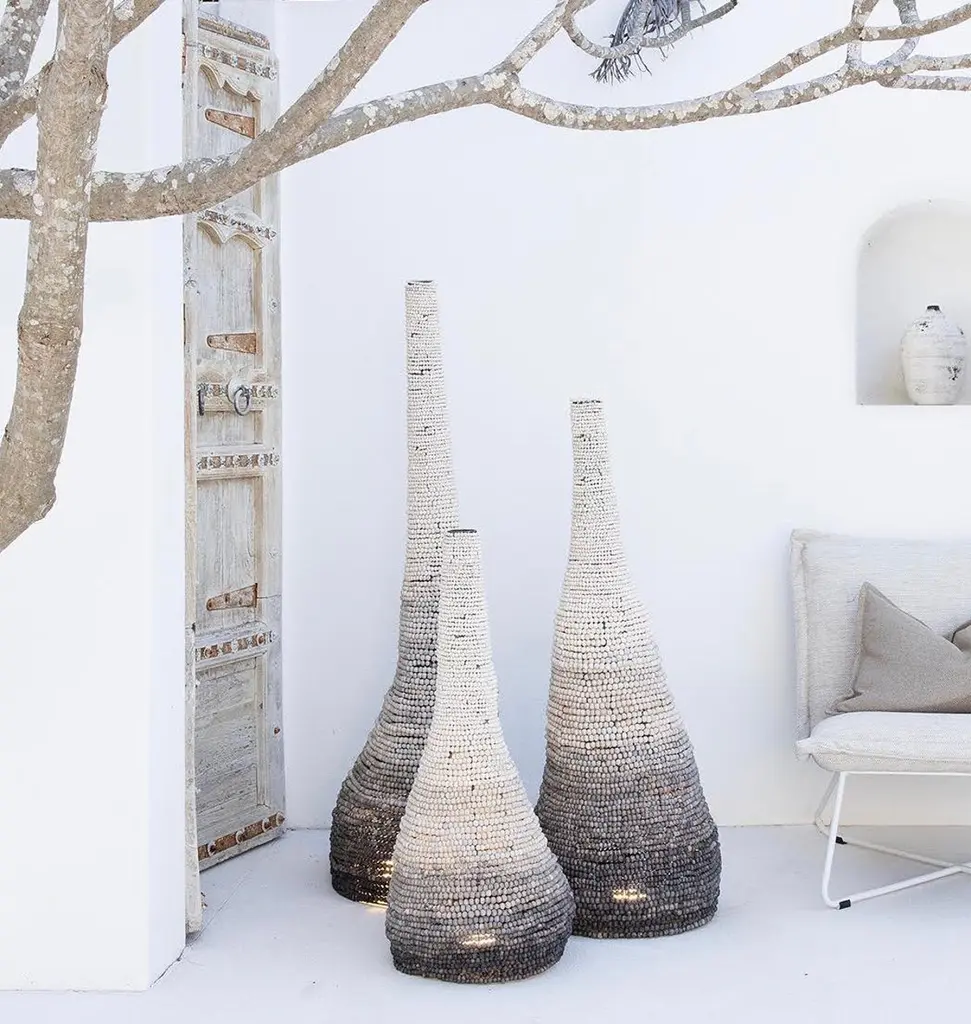Taking the span of almost a year from inception to completion, we are so thrilled to share our new collection which is available now for Pre-Order. The New Moringa Floor Sculpture comes in 3 sizes and is perfect as a set for maximum impact or individually. Each clay bead that makes up the Moringa Floor Sculpture is hand rolled using raw clay. They are sun dried, kiln fired and dip-dyed. They are then masterfully strung onto their own unique iron frame. This hand made process ensures that no two pieces will ever be the same. - Available in three sizes- Optional floor light box available (please note these pieces are not electrified but this can easily be achieved). - Dimensions are approximates as there will always be slight variations in sizes and weights due to the handmade nature of these pieces.