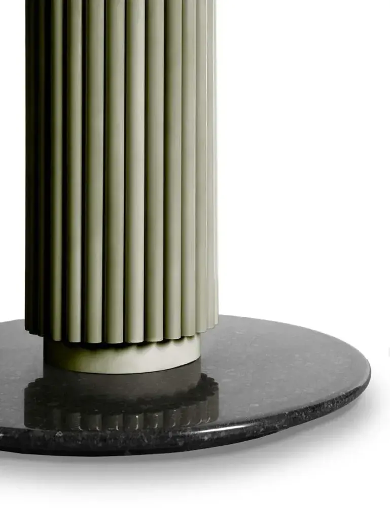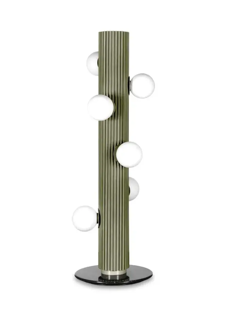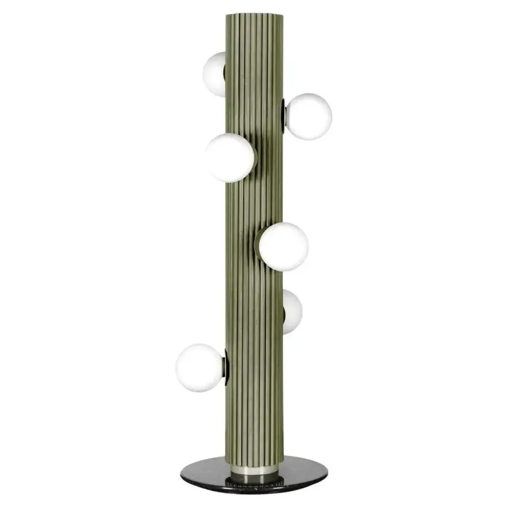 Kleos floor lamp by royal stranger dimensions: d 60 x w 62 x h 190 cm materials: lacquer with glossy finish, blown glass opal diffuser, base polished guatemala green marble. Available in brass, stainless steel and copper with polished or brushed finish, or lacquered in all ncs/ral colors with matte or glossy finish. Base available in carrara marble, nero marquina, estremoz, rose estremoz, guatemala green and emperador with polished or honed finish. Kleos floor lamp echoes ancient canons of balance and proportion. With a flat circular base springing from the ground, it builds itself onto a fluted vertical structure. The main body is surrounded by interspersed opal blown glass diffusers creating a tuneful, dynamic composition. this piece is attributed to the mentioned designer/maker. It has no attribution mark and no official proof of authenticity, however it is well documented in design history. I take full responsibility for any authenticity issues arising from misattribution, up to 250v (europe/uk standard).