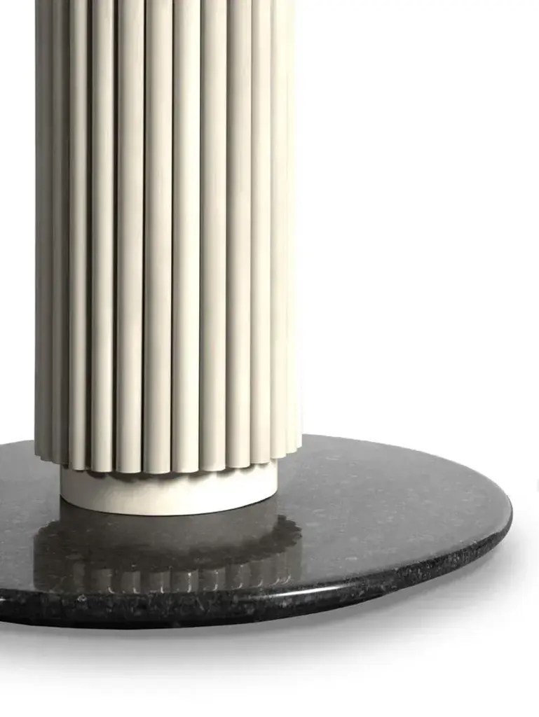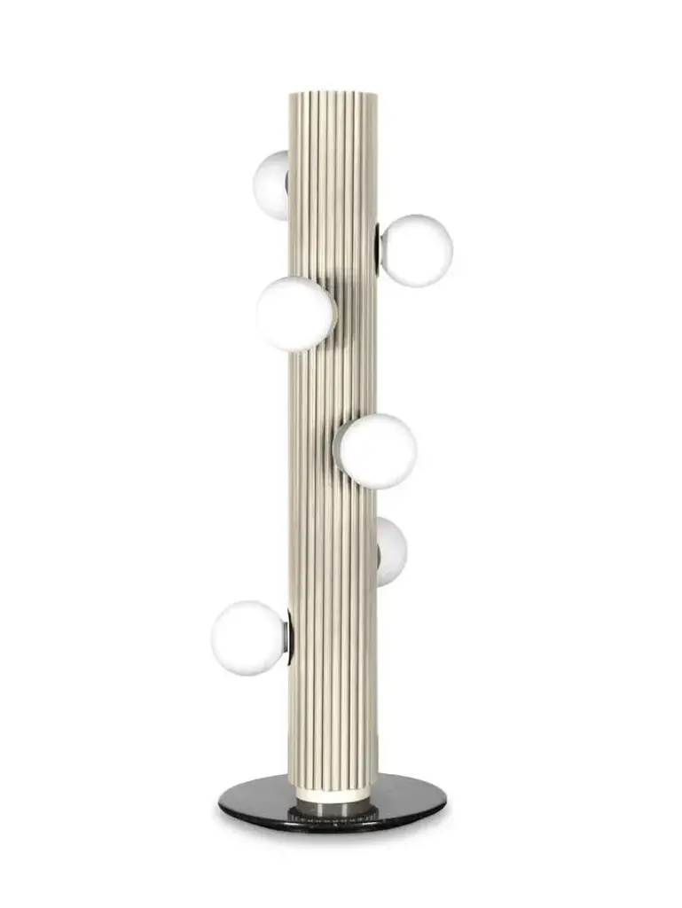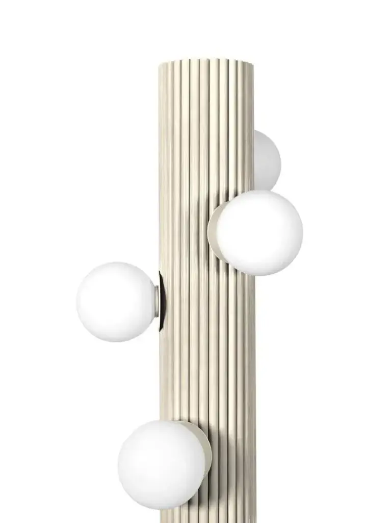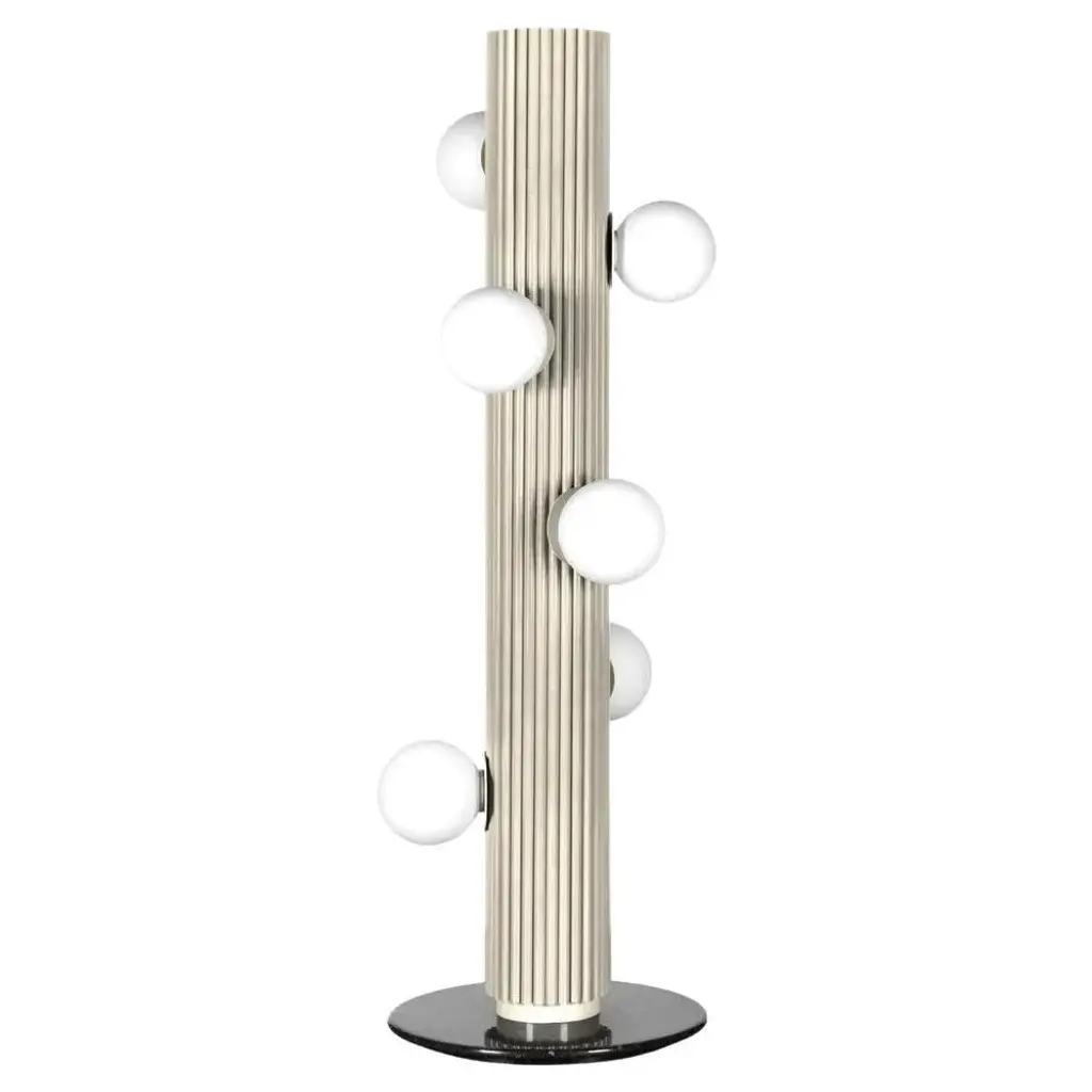 Kleos floor lamp by royal stranger dimensions: d 60 x w 62 x h 190 cm materials: lacquer with glossy finish, blown glass opal diffuser, base polished guatemala green marble. Available in brass, stainless steel and copper with polished or brushed finish, or lacquered in all ncs/ral colors with matte or glossy finish. Base available in carrara marble, nero marquina, estremoz, rose estremoz, guatemala green and emperador with polished or honed finish. Kleos floor lamp echoes ancient canons of balance and proportion. With a flat circular base springing from the ground, it builds itself onto a fluted vertical structure. The main body is surrounded by interspersed opal blown glass diffusers creating a tuneful, dynamic composition. this piece is attributed to the mentioned designer/maker. It has no attribution mark and no official proof of authenticity, however it is well documented in design history. I take full responsibility for any authenticity issues arising from misattribution, up to 250v (europe/uk standard).