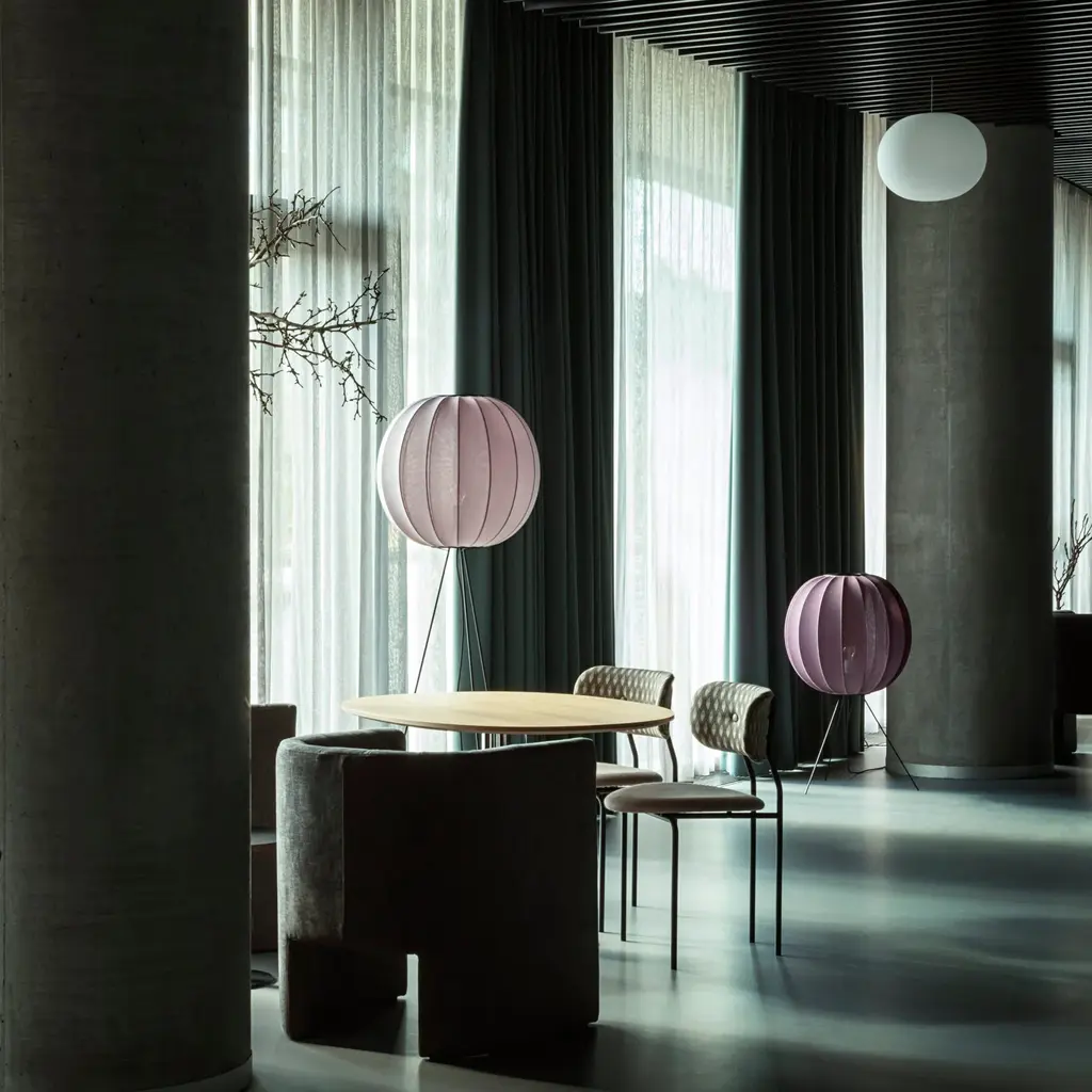 A bold geometrical shape meets a knitted material that’s as cozy as a favorite sweater in Knit-Wit’s floor lamp. The glowing ball of light held aloft on a trio of thin metal legs recalls traditional Chinese paper shades. With the yarn’s open texture, the lampshade both hides and reveals the source of light at its center. “We challenged the barriers of technology,†say design duo Iskos-Berlin, “and came up with something completely new.â€