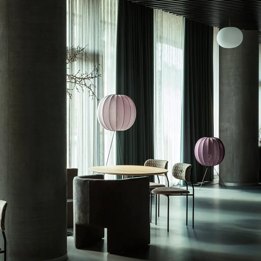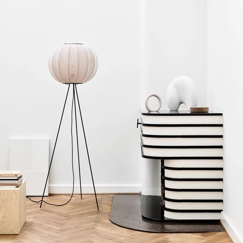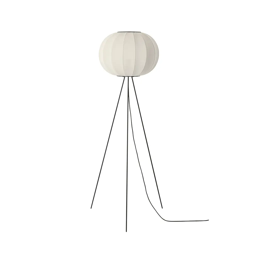 Creating a warm atmosphere in a room is easy with the Made by Hand Knit-Wit High Floor Lamp 45. Design duo Iskos Berlin created the floor lamp with a textile shade that not only filters the light beautifully, but also references traditional knitting techniques. Fine yet durable, the mesh fabric comes to life through CNC knitting, resulting in a 3D pattern with virtually zero waste. The spherical shade has a wonderful structure created by wrapping the textile over a steel frame. Above and below, powder-coated aluminum rings hold the two components together. The lightweight lamp features three slender legs that raise the light source higher to illuminate spaces at eye-level. Thanks to the knitted fabric shade, this floor lamp produces a soft ambient light. Perfect for residential or public areas, the Made by Hand Knit-Wit High Floor Lamp 45 comes in a wide range of colors.