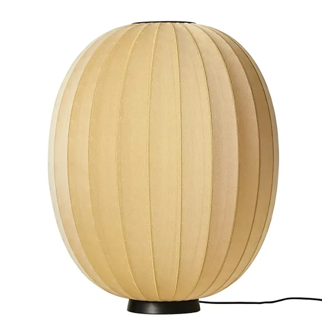 The Knit-Wit Level Oval Floor Lamp from Made by Hand combines contemporary materials with a cozy, organic form. Designed by Iskos-Berlin—the team of Boris Berlin and Aleksej Iskos, it shows off a ribbed internal frame enveloped by a 3D-knitted, flame-retardant polyester shade, offering both texture and transparency. The gently curved silhouette rests on a simple round base, casting soft, even illumination while revealing the lamp’s delicate inner structure in a warm, inviting glow.