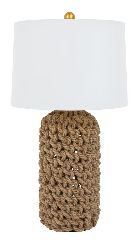 This nautically inspired floor lamp begins as a simple structure with a clear acrylic base but is given bold texture with the addition of natural rope wrapped around its entire body. The single knot detail brings unexpected personality, and the lamp is topped with a banded white linen shade. The matching rope finial is the cherry on top of this uniquely sculptural floor lamp.