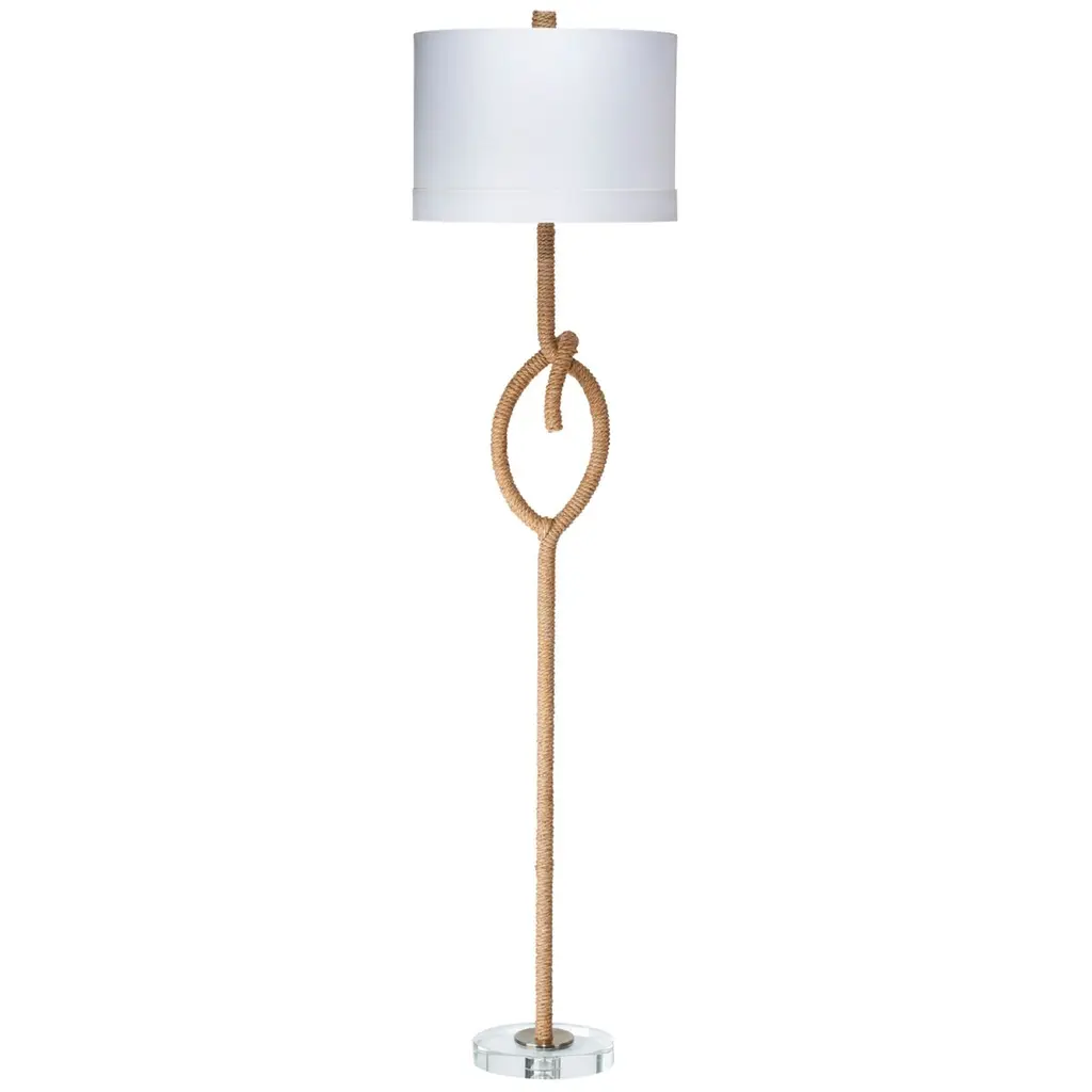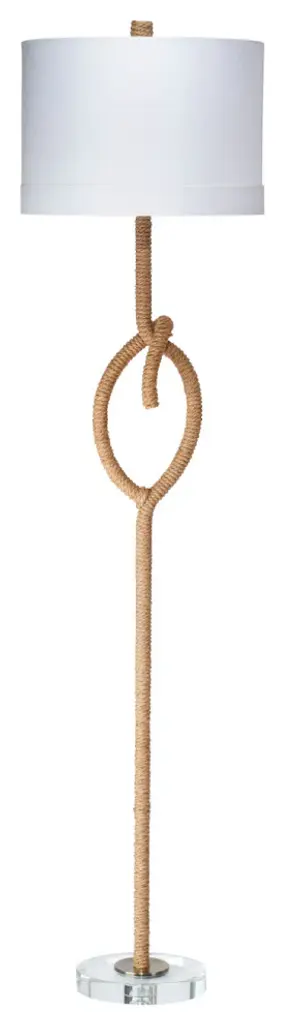 Nautically inspired, this floor lamp is hand-wrapped with natural rope and anchored with an acrylic base. Full of dimension and texture, the single knot detail brings unexpected personality to any room. •Handwoven of corn rope with acrylic base•100% white linen oval shade with 2" bottom band•Matching corn rope finial•10" gold harpThe inherent variations in tone and texture of natural corn rope are preserved, to create pieces rich in detail and natural beauty. These unique imperfections give our products character and individuality, with each piece having its own personality. We"™ve done our best to represent product as closely as possible; however, different lighting and settings in photography, phone or computer settings may slightly affect color and appearance. •Lamp Dimensions: 58.5" H x 9.5" Diameter•Shade Dimensions: 12.5" H x 17" D x 17" W•1 bulb required; Bulb Not Included•150 Max Wattage; Volts 110 •E26 Bulb Base Type •8 Ft Clear Cord•3-way SwitchCare Instructions: We do not recommend using harsh or abrasive cleaners at any time as they can damage product. Wipe surfaces gently with soft, dry cloth. If needed, you may use a lightly damp cloth with water only on base.