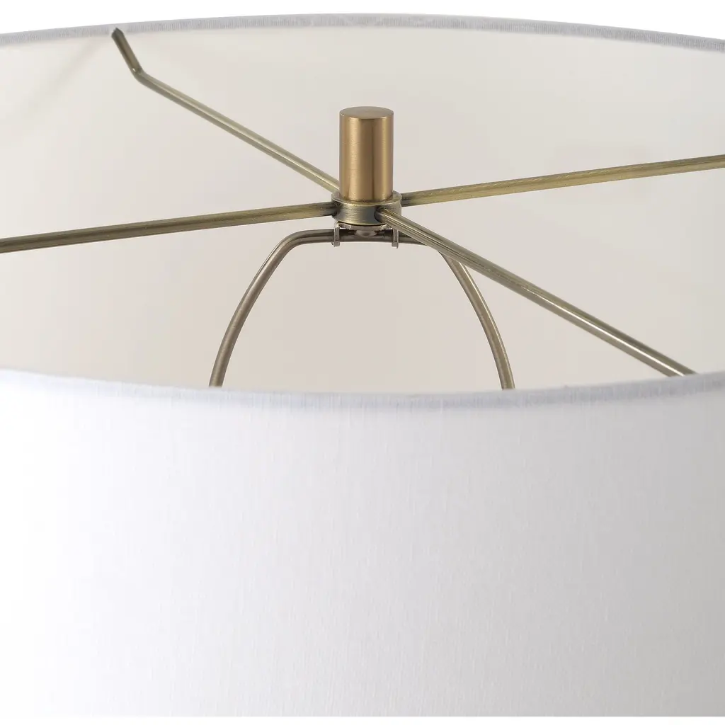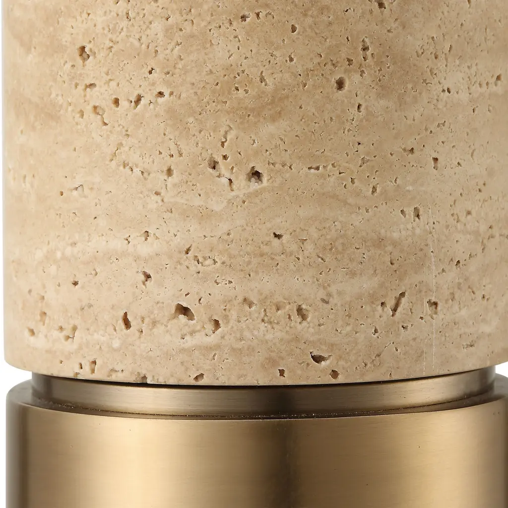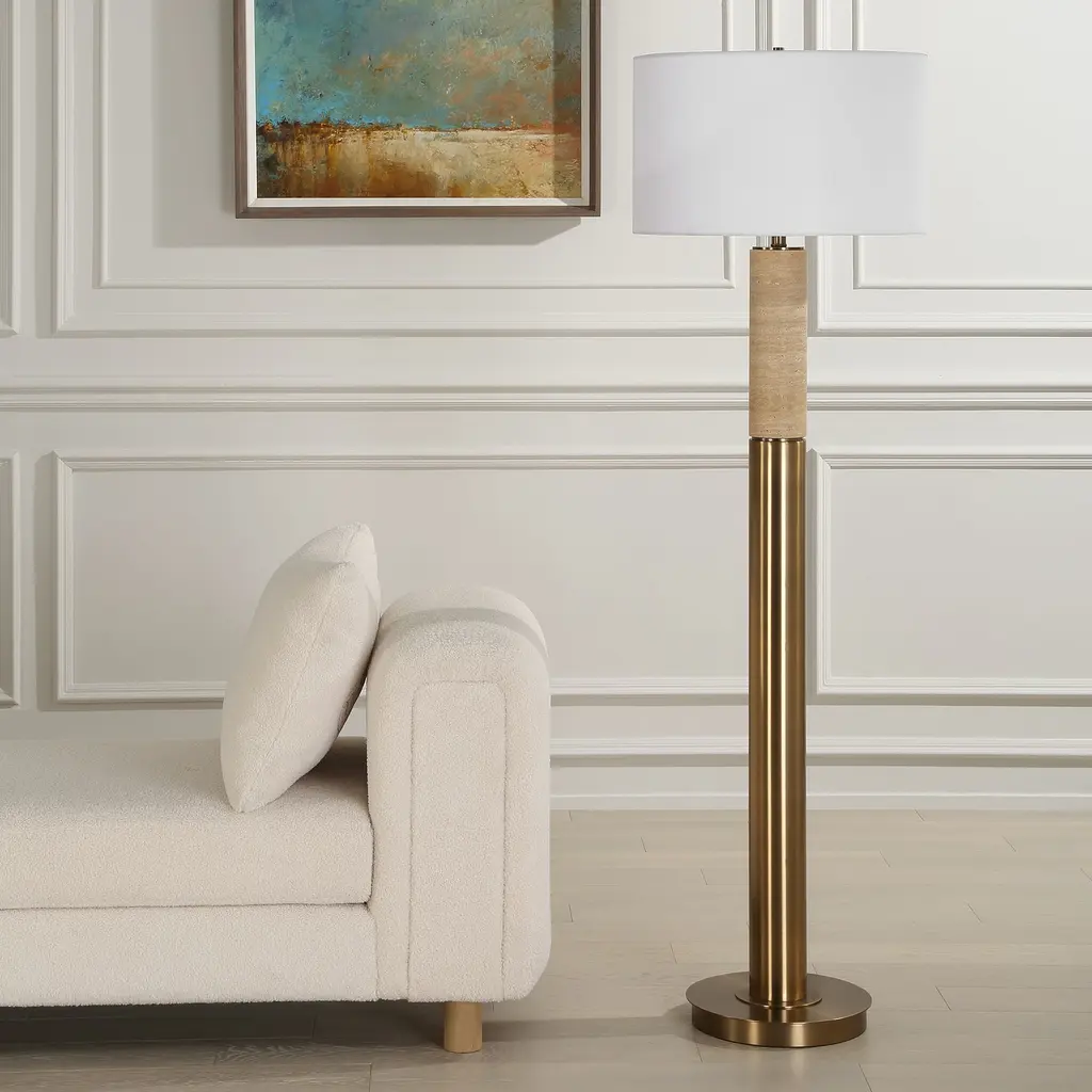 The Knox Floor Lamp Showcases A Solid Travertine Column Displayed On A Matching Antique Brass Plated Body. The Round Hardback Drum Shade Is A Casual White Linen Fabric.