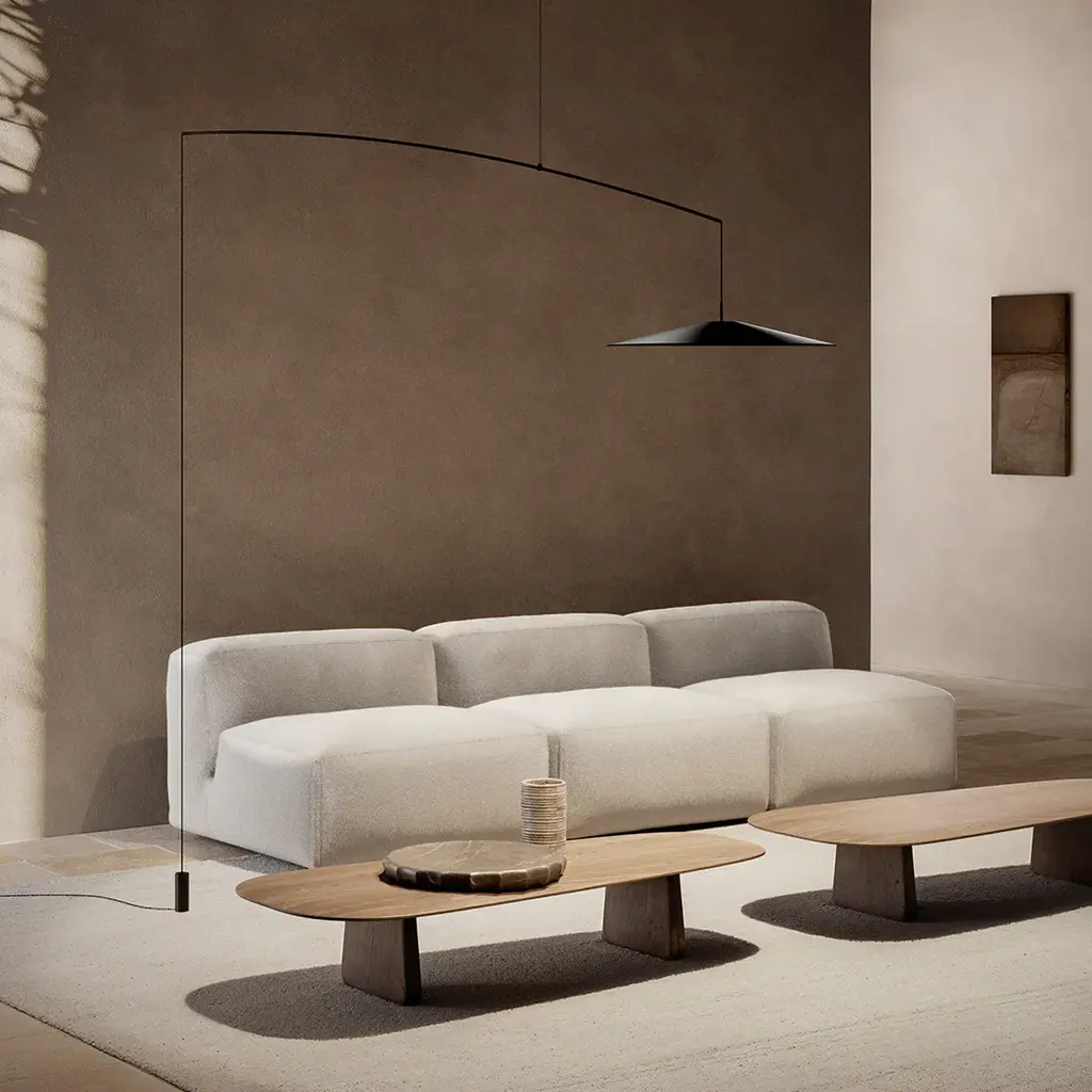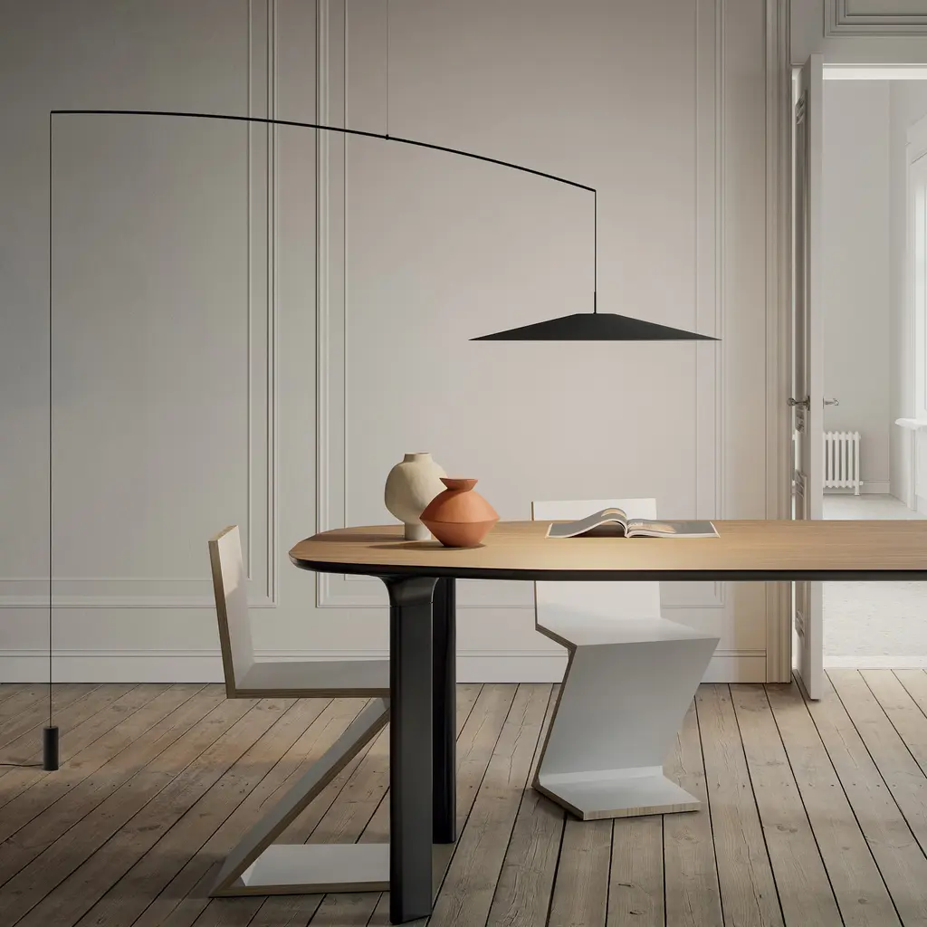 Elevate your space with the Koine LED Floor Lamp from Luceplan. Expertly crafted in Italy, its elegant and pure form, inspired by the concept of "shared language," brings versatility to any room. Suspended from the ceiling with a counterbalance weighing down its slender form, its mineral lens provides a homogenous and distinct light beam, with sharp edges, creating a broad cone of light. Experience luxury in every detail. Highlights