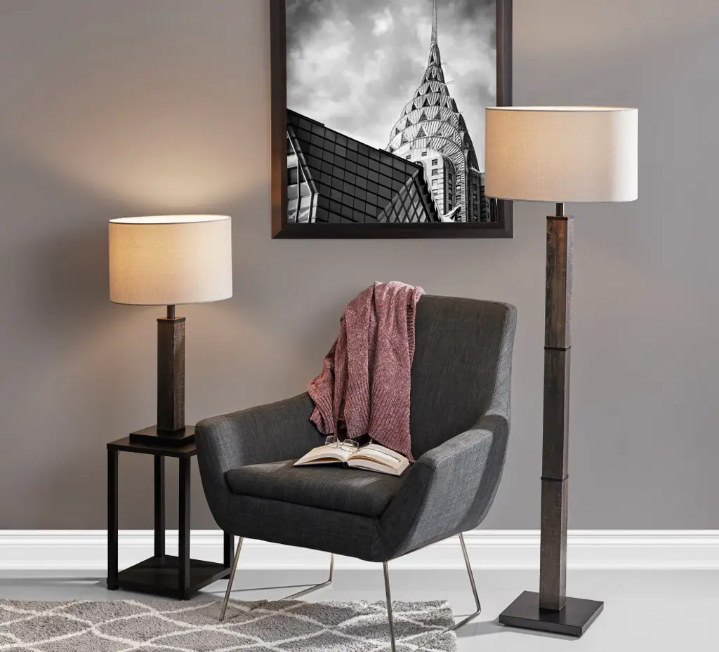 A modern take on rustic charm, the Kona Floor Lamp can elevate the look of your bedroom or living area. A reclaimed wood finish is mixed with black metals and a textured light grey fabric shade, creating a style that can fit perfectly into industrial or farmhouse inspired homes. With a 61" height and a 2.5" thick square pole, this lamp is a substantial piece of decor as well as a functional source of ambient lighting. A 3-way rotary socket witch controls a bulb up to 150W or an equivalent CFL. The 3-way rotary socket switch will only work with a 3-way light bulb, otherwise this lamp will function with simple on/off switch at its highest setting. All Adesso lighting product is either UL or ETL listed, meaning that it has been tested and approved to meet the government-regulated safety standards for the USA. Bulb is not included.