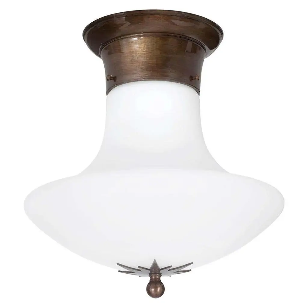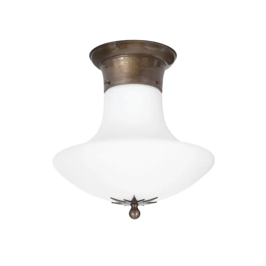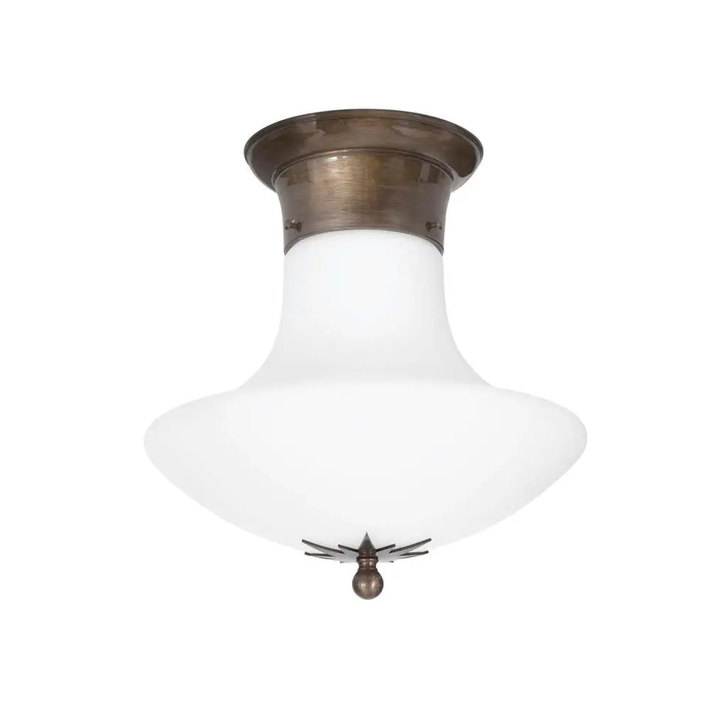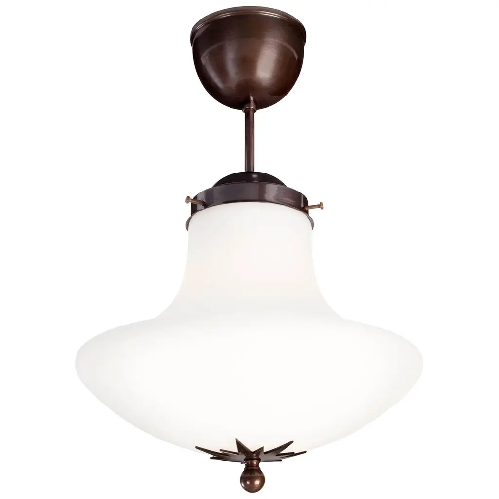 Ceiling lamp model Stoby designed by Konsthantverk and manufactured by themselves. A true Art Nouveau classic in white matte opal glass and oxidized brass.Comes in a number of different sizes.The production of lamps, wall lights and floor lamps are manufactured using craftsman’s techniques with the same materials and techniques as the first models.Materials and color:Oxidized brass/Mat opalglassDimensions:D 11.81 in x H 10.62 inD 30 cm x H 27 cmAvailable in different sizes.Technical details:Max 60 W E27Mounting: hook mountedConnection: Swedish plug, terminal in canopyThe lamps are wired with standard European wiring. Not UL listed.Indoor use and dry locations only.This lamp is wired for Europe, if used in US or any other country the client will need to convert it.Konsthantverk means “Art” and ‘Craftsmanship’, this Swedish company has been manufacturing lamps for nearly one hundred years. They do all the process: milled, drilled, formed and finished. For several years they ran through its own glassworks in Småland for the manufacture of his lamps glass.They have an entire collection for consumers, but they also produce special products as street lighting on Biblioteksgatan in Stockholm or the ceiling lighting at the Kennedy Center in Washington.The Konsthantverk lamps are honest about their dedication to materials and their process, a lamp made by them is a true handicraft. Their creations embodies simplicity and careful consideration, where materials and design are united.Each lamp from Konsthantverk has in itself a part of Swedish History since 1921.