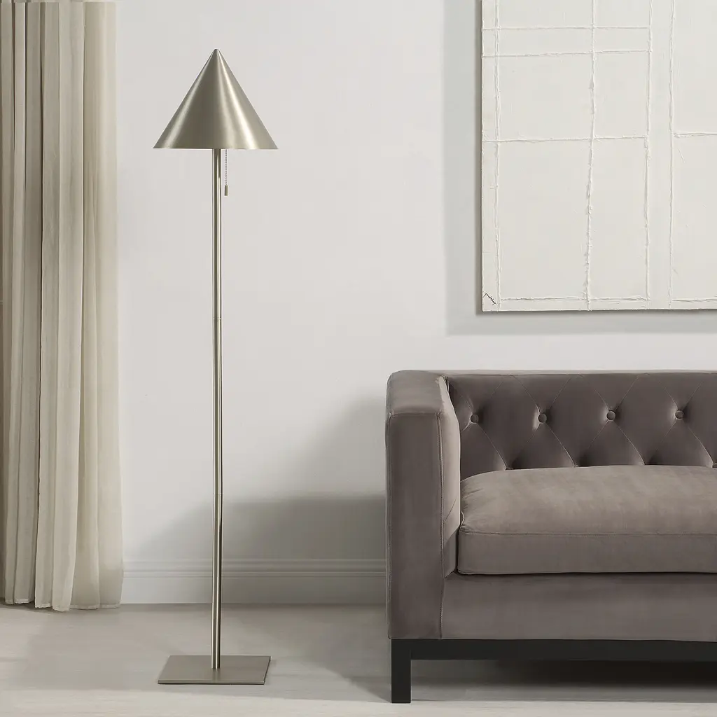 Looking for a statement-making tall floor lamp Arren Williams, Canadian designer and interior stylist puts beautiful light and style within reach with the Kos floor lamp. Blurring the lines between classic design and a mid-century modern aesthetic, it features a clean silhouette that appeals to fans of both decorating schemes. An elegant cone-shaped shade is the crowning glory on top of a sleek elongated base, while a stunning champagne plated finish covers the entire lamp in a luxurious sheen. Set up a pair of these as lamps on either side of a bed as bedroom floor lamps or try one sofa-side as a tall floor lamp. Wherever this lamp sits, ambient light will fill the room with a great glow and impeccable style.
