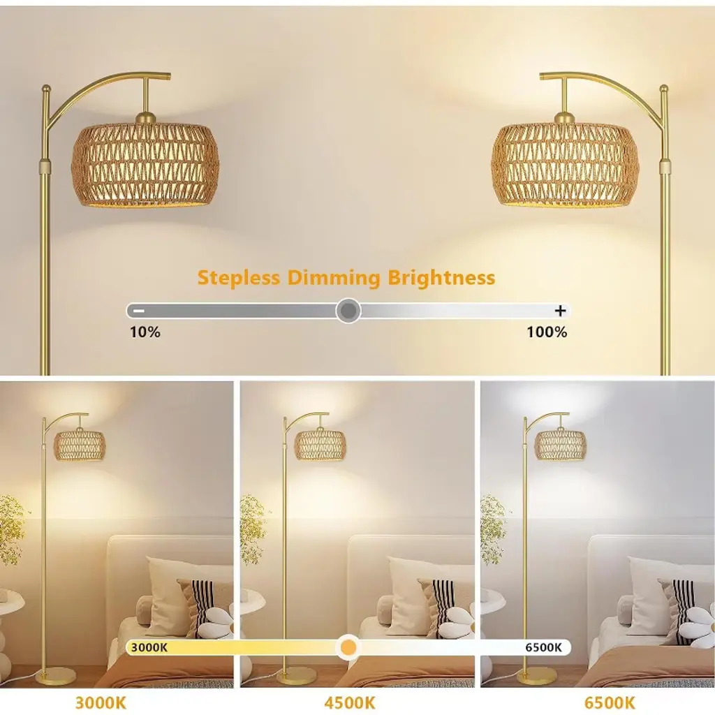 This arc floor lamp adopts a combination remote control & foot switch, assuring convenience for daily life. You can easily turn it on/off, adjust brightness, change colors or set timing modes by buttons, or connect this standing lamp to ¡°Lamp Smart Pro¡± APP, and control this rattan floor lamp with your phone. (Max. remote distance: 65ft/20m, *2 AAA batteries not included)