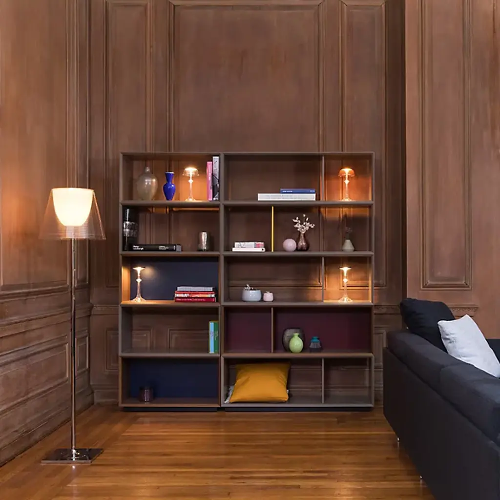 Designed by Philippe Starck, the Flos Ktribe F3 Floor Lamp improves on the F2 Floor Lamp, which improves on the original Miss K...at least size-wise. The F3 features a curved Opal polycarbonate diffuser underneath a large flared shade, available in either translucent metallic or transparent PMMA or plisse cloth. Available in two lamping options.
