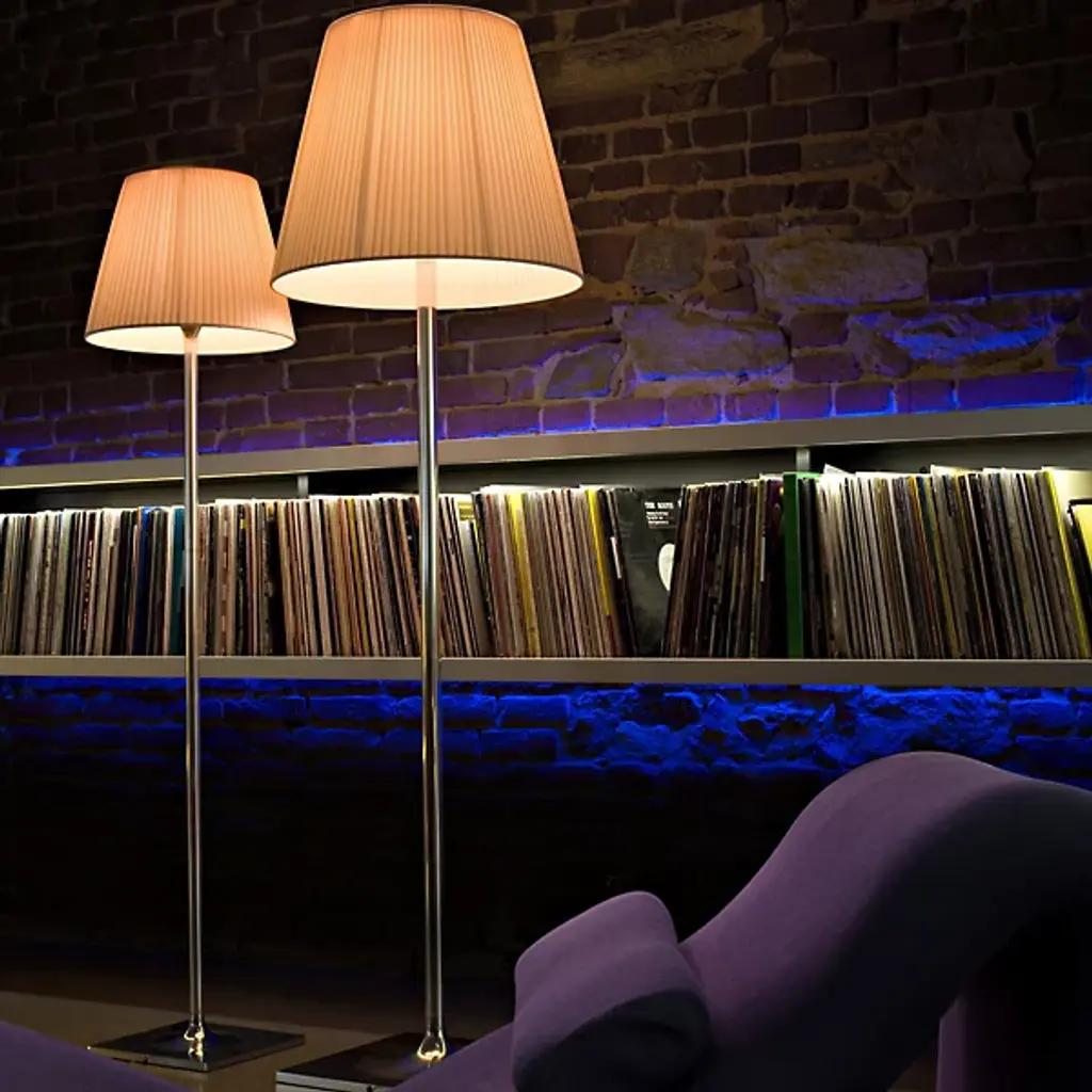 Designed by Philippe Starck, the Flos Ktribe F3 Floor Lamp improves on the F2 Floor Lamp, which improves on the original Miss K...at least size-wise. The F3 features a curved Opal polycarbonate diffuser underneath a large flared shade, available in either translucent metallic or transparent PMMA or plisse cloth. Available in two lamping options.